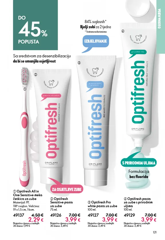 121 izbjeljivanje osobna njega formulacija bez fluorida a optifresh all in one sensitive meka četkica za zube materijal: pp, trp i najlon. veličina: 19 x 1,5 cm, 1 kom. 49137 4,50 € 2,29 € najniža cijena u zadnjih 30 dana: 1,99 € sa sredstvom za desenzibilizaciju da bi se umanjila osjetljivost za osjetljive zube d optifresh pasta za zube s prirodnim uljima 100 ml. 49129 7,00 € 3,99 € najniža cijena u zadnjih 30 dana: 3,49 € c optifresh pro white pasta za zube 100 ml. 49127 7,00 € 3,99 € najniža cijena u zadnjih 30 dana: 3,49 € b optifresh sensitive pasta za zube 75 ml. 49126 7,00 € 3,99 € najniža cijena u zadnjih 30 dana: 3,49 € s prirodnim uljima 84% suglasnih* bjelji zubi za 2 tjedna do 45 % popusta a b c d * testirano na korisnicima