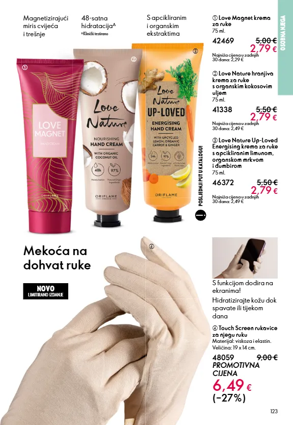 123 osobna njega mekoća na dohvat ruke d touch screen rukavice za njegu ruku materijal: viskoza i elastin. veličina: 19 x 14 cm. 48059 9,00 € promotivna cijena 6,49 € (–27%) novo limitirano izdanje b love nature hranjiva krema za ruke s organskim kokosovim uljem 75 ml. 41338 5,50 € 2,79 € najniža cijena u zadnjih 30 dana: 2,49 € c love nature up-loved energising krema za ruke s apcikliranim limunom, organskom mrkvom i đumbirom 75 ml. 46372 5,50 € 2,79 € najniža cijena u zadnjih 30 dana: 2,49 € a love magnet krema za ruke 75 ml. 42469 5,00 € 2,79 € najniža cijena u zadnjih 30 dana: 2,29 € s apcikliranim i organskim ekstraktima magnetizirajući miris cvijeća i trešnje 48-satna hidratacija ∆ ∆ klinički testirano hidratizirajte kožu dok spavate ili tijekom dana posljednji put u katalogu! s funkcijom dodira na ekranima! a b c d