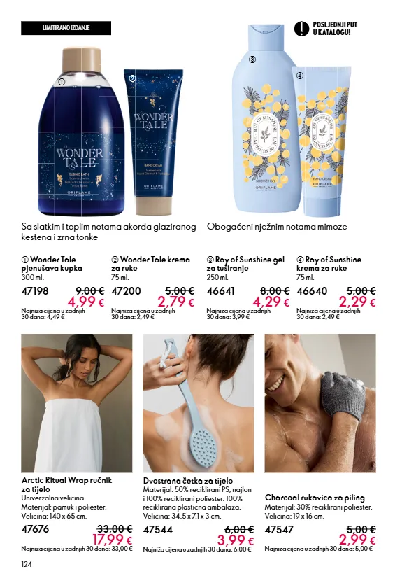 124 limitirano izdanje arctic ritual wrap ručnik za tijelo univerzalna veličina. materijal: pamuk i poliester. veličina: 140 x 65 cm. 47676 33,00 € 17,99 € najniža cijena u zadnjih 30 dana: 33,00 € dvostrana četka za tijelo materijal: 50% reciklirani ps, najlon i 100% reciklirani poliester. 100% reciklirana plastična ambalaža. veličina: 34,5 x 7,1 x 3 cm. 47544 6,00 € 3,99 € najniža cijena u zadnjih 30 dana: 6,00 € charcoal rukavica za piling materijal: 30% reciklirani poliester. veličina: 19 x 16 cm. 47547 5,00 € 2,99 € najniža cijena u zadnjih 30 dana: 5,00 € a wonder tale pjenušava kupka 300 ml. 47198 9,00 € 4,99 € najniža cijena u zadnjih 30 dana: 4,49 € b wonder tale krema za ruke 75 ml. 47200 5,00 € 2,79 € najniža cijena u zadnjih 30 dana: 2,49 € d ray of sunshine krema za ruke 75 ml. 46640 5,00 € 2,29 € najniža cijena u zadnjih 30 dana: 2,49 € c ray of sunshine gel za tuširanje 250 ml. 46641 8,00 € 4,29 € najniža cijena u zadnjih 30 dana: 3,99 € sa slatkim i toplim notama akorda glaziranog kestena i zrna tonke obogaćeni nježnim notama mimoze a b c d posljednji put u katalogu!