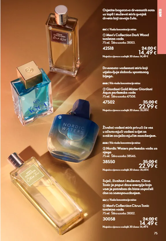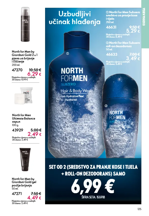 125 north for men ultimate balance sapun 100 g. 43929 5,00 € 2,49 € najniža cijena u zadnjih 30 dana: 2,49 € north for men by giordani gold 2 u 1 pjena za brijanje i čišćenje 200 ml. 47270 10,50 € 6,29 € najniža cijena u zadnjih 30 dana: 4,99 € north for men by giordani gold gel poslije brijanja 50 ml. 47271 7,50 € 4,49 € najniža cijena u zadnjih 30 dana: 3,49 € osobna njega b north for men subzero roll-on dezodorans 50 ml. 46633 7,00 € 3,49 € najniža cijena u zadnjih 30 dana: 3,49 € a north for men subzero sredstvo za pranje kose i tijela 250 ml. 46631 9,50 € 5,29 € najniža cijena u zadnjih 30 dana: 4,49 € uzbudljivi učinak hlađenja set od 2 (sredstvo za pranje kose i tijela + roll-on dezodorans) samo 6,99 € šifra seta: 155918 a b