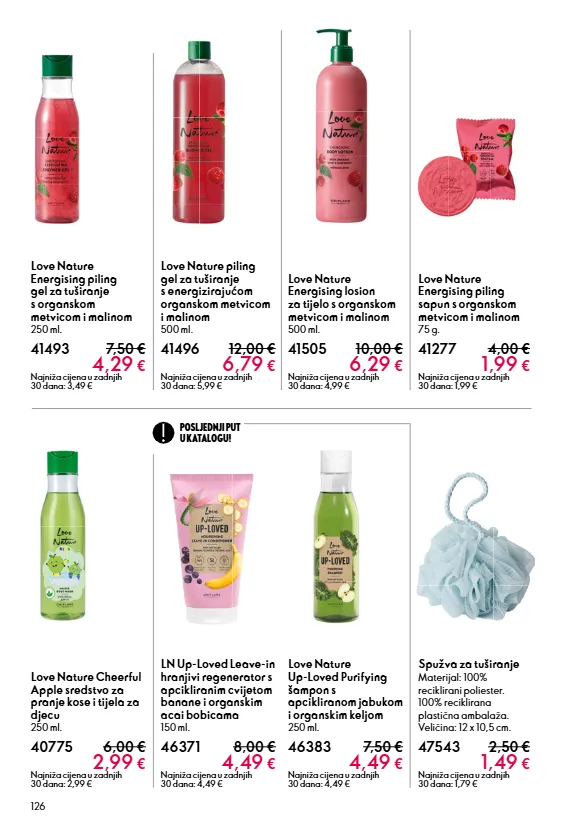 126 love nature cheerful apple sredstvo za pranje kose i tijela za djecu 250 ml. 40775 6,00 € 2,99 € najniža cijena u zadnjih 30 dana: 2,99 € love nature energising piling sapun s organskom metvicom i malinom 75 g. 41277 4,00 € 1,99 € najniža cijena u zadnjih 30 dana: 1,99 € ln up-loved leave-in hranjivi regenerator s apcikliranim cvijetom banane i organskim acai bobicama 150 ml. 46371 8,00 € 4,49 € najniža cijena u zadnjih 30 dana: 4,49 € love nature up-loved purifying šampon s apcikliranom jabukom i organskim keljom 250 ml. 46383 7,50 € 4,49 € najniža cijena u zadnjih 30 dana: 4,49 € spužva za tuširanje materijal: 100% reciklirani poliester. 100% reciklirana plastična ambalaža. veličina: 12 x 10,5 cm. 47543 2,50 € 1,49 € najniža cijena u zadnjih 30 dana: 1,79 € love nature energising piling gel za tuširanje s organskom metvicom i malinom 250 ml. 41493 7,50 € 4,29 € najniža cijena u zadnjih 30 dana: 3,49 € love nature piling gel za tuširanje s energizirajućom organskom metvicom i malinom 500 ml. 41496 12,00 € 6,79 € najniža cijena u zadnjih 30 dana: 5,99 € love nature energising losion za tijelo s organskom metvicom i malinom 500 ml. 41505 10,00 € 6,29 € najniža cijena u zadnjih 30 dana: 4,99 € posljednji put u katalogu!