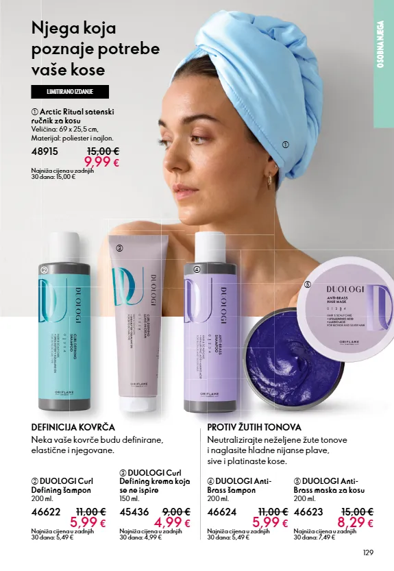 129 osobna njega b duologi curl defining šampon 200 ml. 46622 11,00 € 5,99 € najniža cijena u zadnjih 30 dana: 5,49 € c duologi curl defining krema koja se ne ispire 150 ml. 45436 9,00 € 4,99 € najniža cijena u zadnjih 30 dana: 4,99 € a arctic ritual satenski ručnik za kosu veličina: 69 x 25,5 cm, materijal: poliester i najlon. 48915 15,00 € 9,99 € najniža cijena u zadnjih 30 dana: 15,00 € e duologi anti- brass maska za kosu 200 ml. 46623 15,00 € 8,29 € najniža cijena u zadnjih 30 dana: 7,49 € d duologi anti- brass šampon 200 ml. 46624 11,00 € 5,99 € najniža cijena u zadnjih 30 dana: 5,49 € limitirano izdanje neutralizirajte neželjene žute tonove i naglasite hladne nijanse plave, sive i platinaste kose. neka vaše kovrče budu definirane, elastične i njegovane. definicija kovrča protiv žutih tonova njega koja poznaje potrebe vaše kose c b d e a