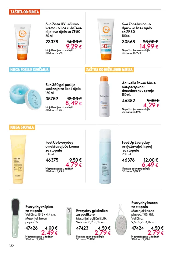132 sun 360 gel poslije sunčanja za lice i tijelo 150 ml. 35759 13,00 € 8,49 € najniža cijena u zadnjih 30 dana: 8,49 € everyday rašpica za stopala veličina: 18,3 x 4,4 cm. materijal: brusni papir i ps. 47426 4,00 € 2,49 € najniža cijena u zadnjih 30 dana: 2,29 € everyday kamen za stopala materijal: kamen plavac, tpr i pet. veličina: 9,5 x 5,7 x 3,0 cm. 47424 4,50 € 2,79 € najniža cijena u zadnjih 30 dana: 2,79 € everyday grickalica za pedikuru materijal: ugljični čelik. veličina: 8,2 x 1,2 cm. 47423 4,50 € 2,79 € najniža cijena u zadnjih 30 dana: 2,49 € feet up everyday omekšavajuća krema za stopala 150 ml. 46375 9,50 € 4,79 € najniža cijena u zadnjih 30 dana: 3,99 € feet up everyday osvježavajući sprej za stopala 250 ml. 46376 12,00 € 6,49 € najniža cijena u zadnjih 30 dana: 5,99 € njega poslije sunčanja njega stopala sun zone uv zaštitna krema za lice i izložene dijelove tijela sa zf 50 50 ml. 23378 14,00 € 9,29 € najniža cijena u zadnjih 30 dana: 9,29 € sun zone losion za djecu za lice i tijelo sa zf 50 100 ml. 30568 23,00 € 14,99 € najniža cijena u zadnjih 30 dana: 15,99 € zaštita od sunca activelle power move antiperspirant dezodorans u spreju 150 ml. 46382 9,00 € 4,29 € najniža cijena u zadnjih 30 dana: 4,49 € zaštita od neželjenih mirisa