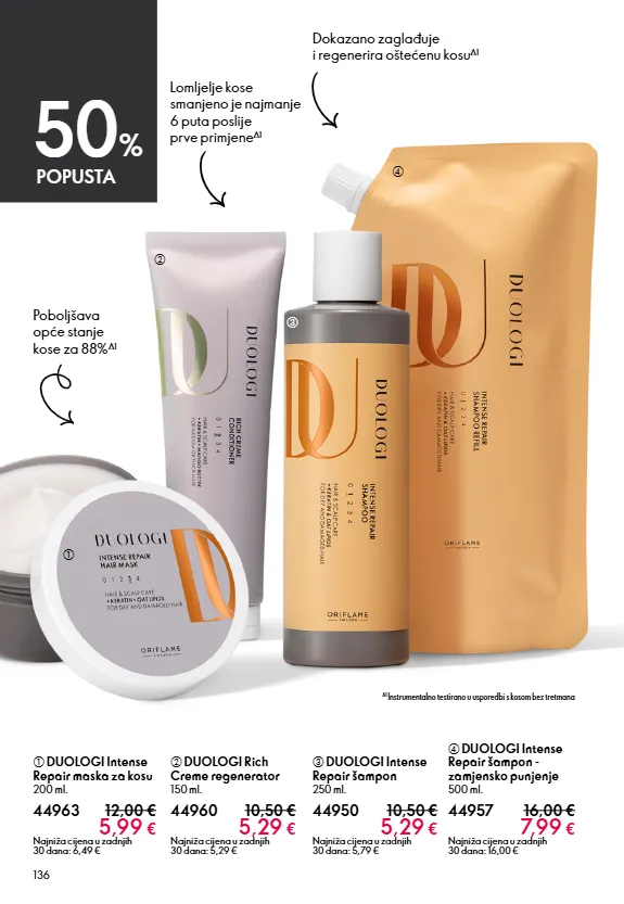 136 c DUOLOGI Intense Repair šampon 250 ml. 44950 10,50 € 5,29 € Najniža cijena u zadnjih 30 dana: 5,79 € a DUOLOGI Intense Repair maska za kosu 200 ml. 44963 12,00 € 5,99 € Najniža cijena u zadnjih 30 dana: 6,49 € d DUOLOGI Intense Repair šampon - zamjensko punjenje 500 ml. 44957 16,00 € 7,99 € Najniža cijena u zadnjih 30 dana: 16,00 € b DUOLOGI Rich Creme regenerator 150 ml. 44960 10,50 € 5,29 € Najniža cijena u zadnjih 30 dana: 5,29 € Dokazano zaglađuje i regenerira oštećenu kosu ∆1 ∆1 Instrumentalno testirano u usporedbi s kosom bez tretmana Lomljelje kose smanjeno je najmanje 6 puta poslije prve primjene ∆1 Poboljšava op ć e stanje kose za 88% ∆1 50 % POPUSTA a b c d