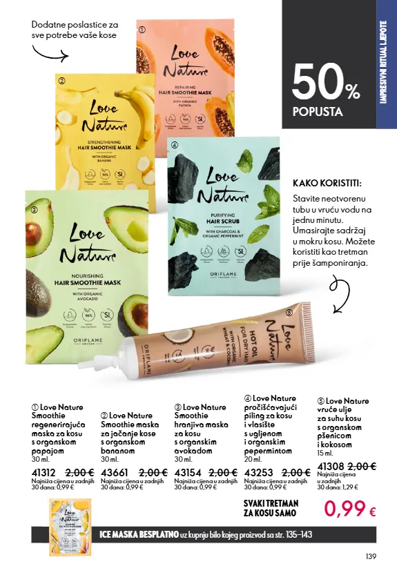 section name 139 d love nature pročišćavajući piling za kosu i vlasište s ugljenom i organskim pepermintom 20 ml. 43253 2,00 € najniža cijena u zadnjih 30 dana: 0,99 € b love nature smoothie maska za jačanje kose s organskom bananom 30 ml. 43661 2,00 € najniža cijena u zadnjih 30 dana: 0,99 € c love nature smoothie hranjiva maska za kosu s organskim avokadom 30 ml. 43154 2,00 € najniža cijena u zadnjih 30 dana: 0,99 € a love nature smoothie regenerirajuća maska za kosu s organskom papajom 30 ml. 41312 2,00 € najniža cijena u zadnjih 30 dana: 0,99 € impresivni ritual ljepote ice maska besplatno uz kupnju bilo kojeg proizvod sa str. 135−143 e love nature vruće ulje za suhu kosu s organskom pšenicom i kokosom 15 ml. 41308 2,00 € najniža cijena u zadnjih 30 dana: 1,29 € 0,99 € 50 % popusta dodatne poslastice za sve potrebe vaše kose stavite neotvorenu tubu u vruću vodu na jednu minutu. umasirajte sadržaj u mokru kosu. možete koristiti kao tretman prije šamponiranja. svaki tretman za kosu samo kako koristiti: a b c d e