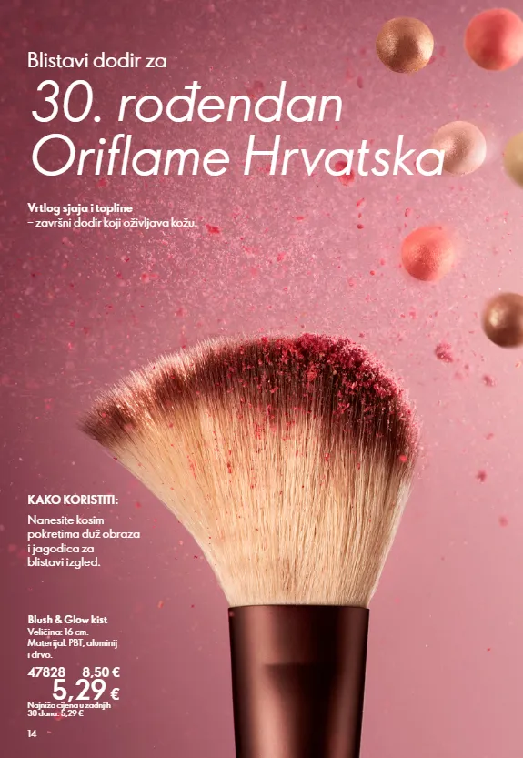 14 Blush & Glow kist Veličina: 16 cm. Materijal: PBT, aluminij i drvo. 47828 8,50 € 5,29 € Najniža cijena u zadnjih 30 dana: 5,29 € Vrtlog sjaja i topline – završni dodir koji oživljava kožu. Blistavi dodir za 30. rođendan Oriflame Hrvatska Nanesite kosim pokretima duž obraza i jagodica za blistavi izgled. KAKO KORISTITI: