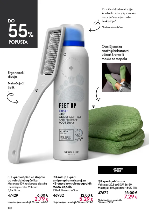 140 b feet up expert antiperspirantni sprej za 48-satnu kontrolu neugodnih mirisa stopala 150 ml. limena bočica. 46982 12,00 € 5,29 € najniža cijena u zadnjih 30 dana: 5,29 € c expert gel čarape veličina: (22,5 cm) eur 36-39. materijal: 50% poliester i 50% tpr. 47672 13,00 € 7,29 € najniža cijena u zadnjih 30 dana: 7,79 € a expert rašpica za stopala od nehrđajućeg čelika materijal: 50% reciklirana plastika i nehrđajući čelik. veličina: 3,8 x 19 cm. 47429 6,00 € 2,79 € najniža cijena u zadnjih 30 dana: 6,00 € do 55 % popusta a b c limitirano izdanje osmišljene za snažniji hidratantni učinak kreme ili maske za stopala pro-resist tehnologija kontrolira znoj i pomaže u sprječavanju rasta bakterija* * testirano na potrošačima ergonomski dizajn nehrđajući čelik