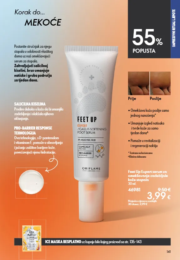 SECTION NAME 141 Feet Up Expert serum za omekšavanje zadebljale kože stopala 30 ml. 46981 9,50 € 3,99 € Najniža cijena u zadnjih 30 dana: 3,99 € SALICILNA KISELINA Prodire duboko u kožu da bi umanjila zadebljanja i olakšala njihovo uklanjanje. PRO-BARRIER RESPONSE TEHNOLOGIJA Ova tehnologija, s D-pantenolom i vitaminom F, pomaže u obnavljanju i jačanju zaštitne barijere kože, povećavajući njenu hidrataciju. ∆ Klinično dokazano * Testirano na korisnicama Postanite stručnjak za njegu stopala u udobnosti vlastitog doma uz naš omekšavajući serum za stopala. Zahvaljujući salicilnoj kiselini, brzo umanjuje natiske i gruba područja za tjedan dana. • Pomaže u revitalizaciji i regeneraciji noktiju • Umanjuje izgled natisaka i tvrde kože za samo tjedan dana ∆ • Omekšava kožu poslije samo jednog nanošenja* IMPRESIVNI RITUAL LJEPOTE 55 % POPUSTA ICE MASKA BESPLATNO uz kupnju bilo kojeg proizvod sa str. 135−143 Prije Poslije Korak do... MEKOĆE