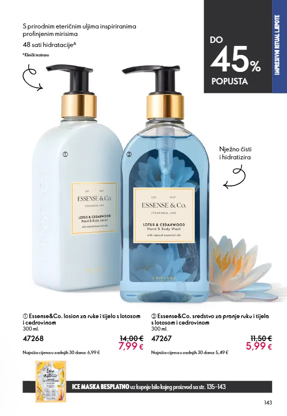 SECTION NAME 143 a Essense&Co. losion za ruke i tijelo s lotosom i cedrovinom 300 ml. 47268 14,00 € 7,99 € Najniža cijena u zadnjih 30 dana: 6,99 € b Essense&Co. sredstvo za pranje ruku i tijela s lotosom i cedrovinom 300 ml. 47267 11,50 € 5,99 € Najniža cijena u zadnjih 30 dana: 5,49 € 48 sati hidratacije ∆ S prirodnim eteričnim uljima inspiriranima profinjenim mirisima Nježno čisti i hidratizira ∆ Klinički testirano IMPRESIVNI RITUAL LJEPOTE DO 45 % POPUSTA ICE MASKA BESPLATNO uz kupnju bilo kojeg proizvod sa str. 135−143 a b