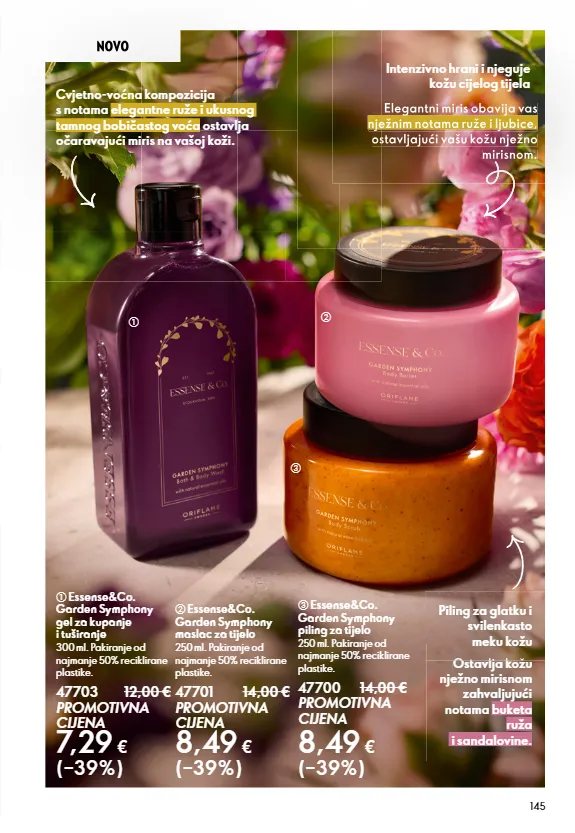145 c essense&co. garden symphony piling za tijelo 250 ml. pakiranje od najmanje 50% reciklirane plastike. 47700 14,00 € promotivna cijena 8,49 € (–39%) a essense&co. garden symphony gel za kupanje i tuširanje 300 ml. pakiranje od najmanje 50% reciklirane plastike. 47703 12,00 € promotivna cijena 7,29 € (–39%) novo ostavlja kožu nježno mirisnom zahvaljujući notama buketa ruža i sandalovine. novo cvjetno-voćna kompozicija s notama elegantne ruže i ukusnog tamnog bobičastog voća ostavlja očaravajući miris na vašoj koži. ostavlja kožu piling za glatku i svilenkasto meku kožu b essense&co. garden symphony maslac za tijelo 250 ml. pakiranje od najmanje 50% reciklirane plastike. 47701 14,00 € promotivna cijena 8,49 € (–39%) elegantni miris obavija vas nježnim notama ruže i ljubice, ostavljajući vašu kožu nježno mirisnom. a b c elegantni miris obavija vas elegantni miris obavija vas nježnim notama ruže i ljubice, nježnim notama ruže i ljubice, nježnim notama ruže i ljubice, ostavljajući vašu kožu nježno ostavljajući vašu kožu nježno mirisnom. intenzivno hrani i njeguje kožu cijelog tijela