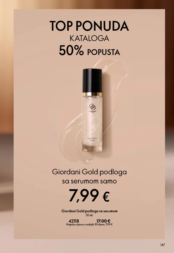 147 TOP PONUDA KATALOGA 50% POPUSTA Giordani Gold podloga sa serumom 30 ml. 42118 17,00 € Najniža cijena u zadnjih 30 dana: 7,99 € 7,99 € Giordani Gold podloga sa serumom samo