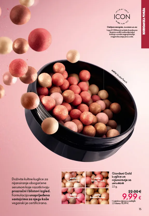 SECTION NAME 15 Giordani Gold kuglice za nijansiranje sa serumom 22 g. 22,00 € 9,99 € Najniža cijena u zadnjih 30 dana: 10,99 € 44915 Natural Flush Giordani Gold kuglice za nijansiranje sa serumom 44916 Strobe Peach 44917 Glowy Rose 22 g. 9,99 Najniža cijena u zadnjih 30 dana: 10,99 € 22 g. 9,99 44918 Radiant Bronze Logo ICON koristi se kako bi pokazao da proizvod(i) zadovoljava(ju) kriterije za naše najpopularnije i najprodavanije proizvode. Omiljeno mnogima, stvoreno za vas Doživite kultne kuglice za nijansiranje obogaćene serumom koje razotkrivaju prozračni i blistavi izgled. Formulacija unaprijeđena sastojcima za njegu kože veganski je certificirana. ROĐENDANSKA PONUDA 44916 Strobe Peach