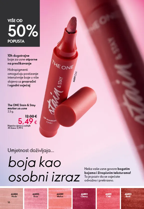 16 46888 Nude 46890 Rose 46889 Melon 46892 Cherry 46891 Chili 46893 Brick Umjetnost doživljaja... boja kao osobni izraz Neka vaše usne govore bogatim bojama i živopisnim teksturama! To je poziv da se osjećate odvažno i prekrasno. 10h dugotrajne boje za usne otporne na preslikavanje Hidropigmenti omogućuju postizanje intenzivnije boje u više slojeva uz prozračni i ugodni osjećaj The ONE Stain & Stay marker za usne 2,5 g. 12,00 € 5,49 € Najniža cijena u zadnjih 30 dana: 5,99 € VIŠE OD 50% POPUSTA 46891 Chili