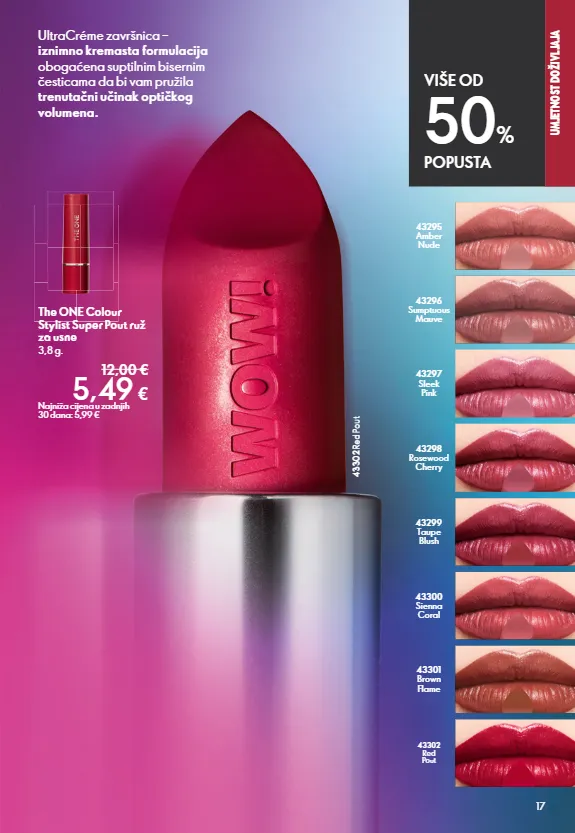 SECTION NAME 17 43295 Amber Nude 43296 Sumptuous Mauve 43297 Sleek Pink 43298 Rosewood Cherry 43299 Taupe Blush 43300 Sienna Coral 43301 Brown Flame 43302 Red Pout UltraCréme završnica – iznimno kremasta formulacija obogaćena suptilnim bisernim česticama da bi vam pružila trenutačni učinak optičkog volumena. UMJETNOST DOŽIVLJAJA VIŠE OD 50 % POPUSTA 43302 Red Pout The ONE Colour Stylist Super Pout ruž za usne 3,8 g. 12,00 € 5,49 € Najniža cijena u zadnjih 30 dana: 5,99 €