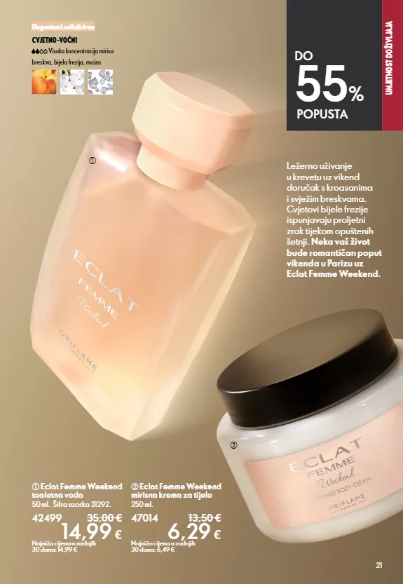 SECTION NAME 21 UMJETNOST DOŽIVLJAJA b Eclat Femme Weekend mirisna krema za tijelo 250 ml. 47014 13,50 € 6,29 € Najniža cijena u zadnjih 30 dana: 6,49 € a Eclat Femme Weekend toaletna voda 50 ml. Šifra uzorka 31292. 42499 35,00 € 14,99 € Najniža cijena u zadnjih 30 dana: 14,99 € breskva, bijela frezija, mošus Visoka koncentracija mirisa CVJETNO-VOĆNI Elegantan i sofisticiran DO 55 % POPUSTA Ležerno uživanje u krevetu uz vikend doručak s kroasanima i svježim breskvama. Cvjetovi bijele frezije ispunjavaju proljetni zrak tijekom opuštenih šetnji. Neka vaš život bude romantičan poput vikenda u Parizu uz Eclat Femme Weekend. a b