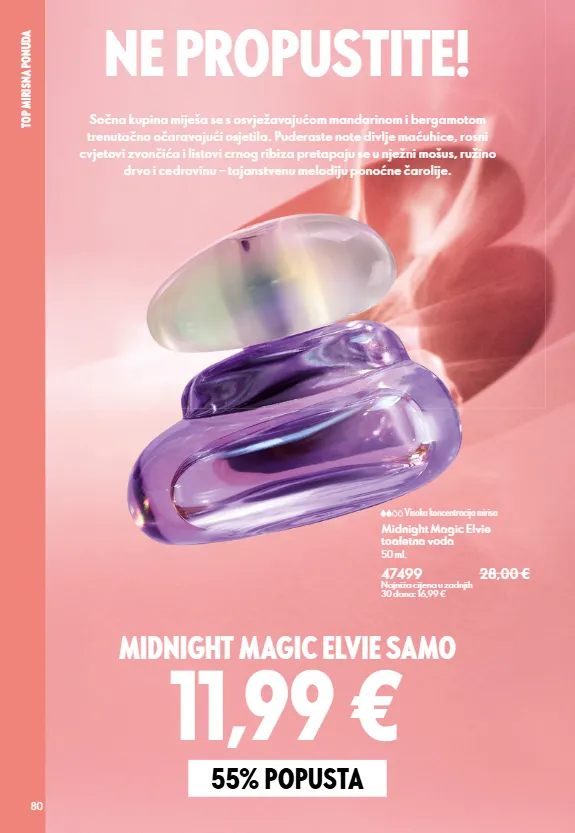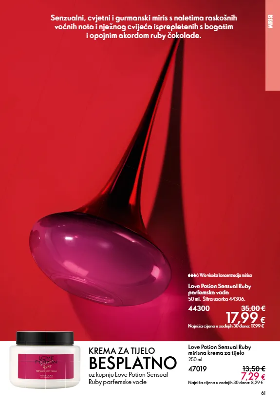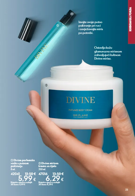 SECTION NAME 23 Ostavlja kožu glamurozno mirisnom zahvaljujući kultnom Divine mirisu. ROĐENDANSKA PONUDA a Divine parfemska voda u putnom pakiranju 8 ml. 42041 12,50 € 5,99 € Najniža cijena u zadnjih 30 dana: 6,99 € b Divine mirisna krema za tijelo 250 ml. 47016 13,50 € 6,29 € Najniža cijena u zadnjih 30 dana: 8,29 € Imajte svoje putno pakiranje pri ruci i osvježavajte miris po potrebi. a b