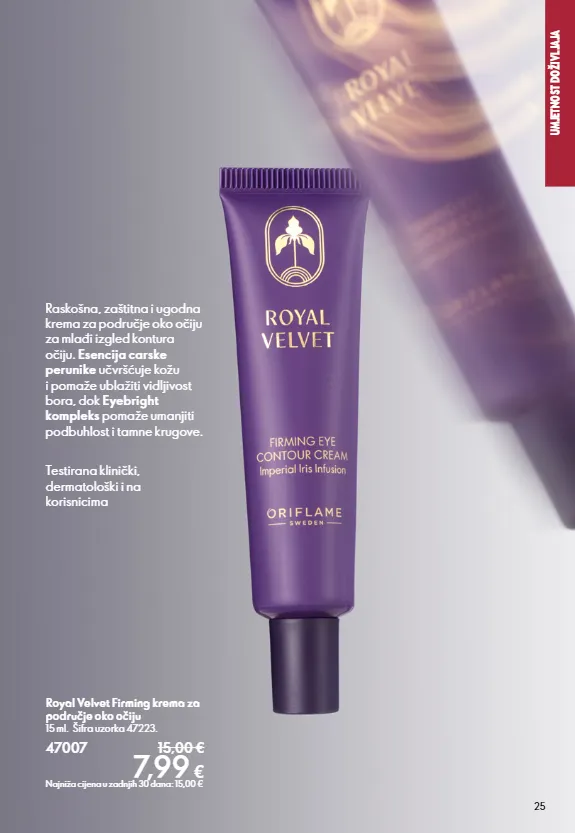 SECTION NAME 25 Royal Velvet Firming krema za područje oko očiju 15 ml. Šifra uzorka 47223. 47007 15,00 € 7,99 € Najniža cijena u zadnjih 30 dana: 15,00 € UMJETNOST DOŽIVLJAJA Raskošna, zaštitna i ugodna krema za područje oko očiju za mlađi izgled kontura očiju. Esencija carske perunike učvršćuje kožu i pomaže ublažiti vidljivost bora, dok Eyebright kompleks pomaže umanjiti podbuhlost i tamne krugove. Testirana klinički, dermatološki i na korisnicima
