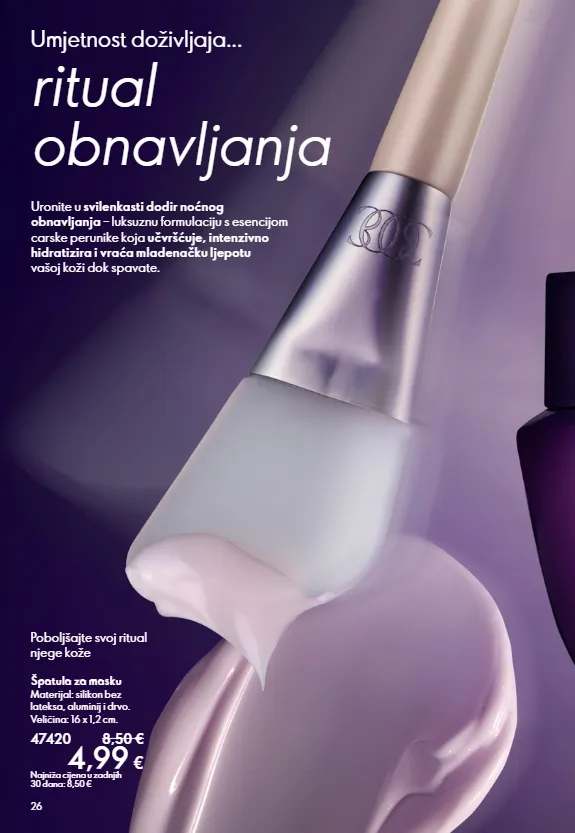 26 Poboljšajte svoj ritual njege kože Špatula za masku Materijal: silikon bez lateksa, aluminij i drvo. Veličina: 16 x 1,2 cm. 47420 8,50 € 4,99 € Najniža cijena u zadnjih 30 dana: 8,50 € Uronite u svilenkasti dodir noćnog obnavljanja – luksuznu formulaciju s esencijom carske perunike koja učvršćuje, intenzivno hidratizira i vraća mladenačku ljepotu vašoj koži dok spavate. Umjetnost doživljaja... ritual obnavljanja