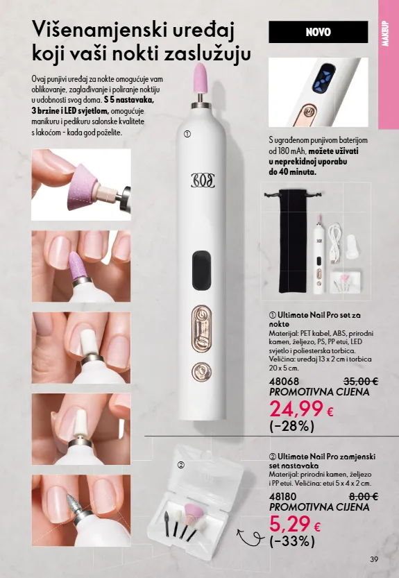 39 MAKEUP b Ultimate Nail Pro zamjenski set nastavaka Materijal: prirodni kamen, željezo i PP etui. Veličina: etui 5 x 4 x 2 cm. 48180 8,00 € PROMOTIVNA CIJENA 5,29 € (–33%) NOVO a Ultimate Nail Pro set za nokte Materijal: PET kabel, ABS, prirodni kamen, željezo, PS, PP etui, LED svjetlo i poliesterska torbica. Veličina: uređaj 13 x 2 cm i torbica 20 x 5 cm. 48068 35,00 € PROMOTIVNA CIJENA 24,99 € (–28%) Višenamjenski uređaj koji vaši nokti zaslužuju Ovaj punjivi uređaj za nokte omogućuje vam oblikovanje, zaglađivanje i poliranje noktiju u udobnosti svog doma. S 5 nastavaka, 3 brzine i LED svjetlom, omogućuje manikuru i pedikuru salonske kvalitete s lakoćom - kada god poželite. S ugrađenom punjivom baterijom od 180 mAh, možete uživati u neprekidnoj uporabu do 40 minuta. a b