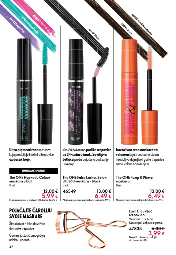42 the one false lashes salon lift 360 maskara - black 8 ml. 46549 13,00 € 6,49 € najniža cijena u zadnjih 30 dana: 6,49 € the one hypnotic colour maskara u boji 8 ml. 12,00 € 5,99 € najniža cijena u zadnjih 30 dana: 12,00 € the one pump & plump maskara 8 ml. 12,00 € 6,49 € najniža cijena u zadnjih 30 dana: 5,99 € lash lift uvijač trepavica veličina: 10 x 6 cm. materijal: željezo i guma. 47835 6,00 € 3,99 € najniža cijena u zadnjih 30 dana: 6,00 € 47480 party pink 47534 minty magic 47533 purple pop 46549 black vodootporna 46896 black 46897 black pojačajte čaroliju svoje maskare široki otvor - lako dosežete do svake trepavice gumeni jastučić omogućuje udobnu uporabu klinički dokazano podiže trepavice uz 24-satni učinak. savitljiva četkica pruža pojačano podizanje i uvijanje. intenzivno crna maskara za volumen koja trenutačno stvara neodoljivo dojmljive i guste trepavice samo jednim nanošenjem. ultra pigmentirana maskara koja produljuje i definira trepavice uz dašak boje. limitirano izdanje