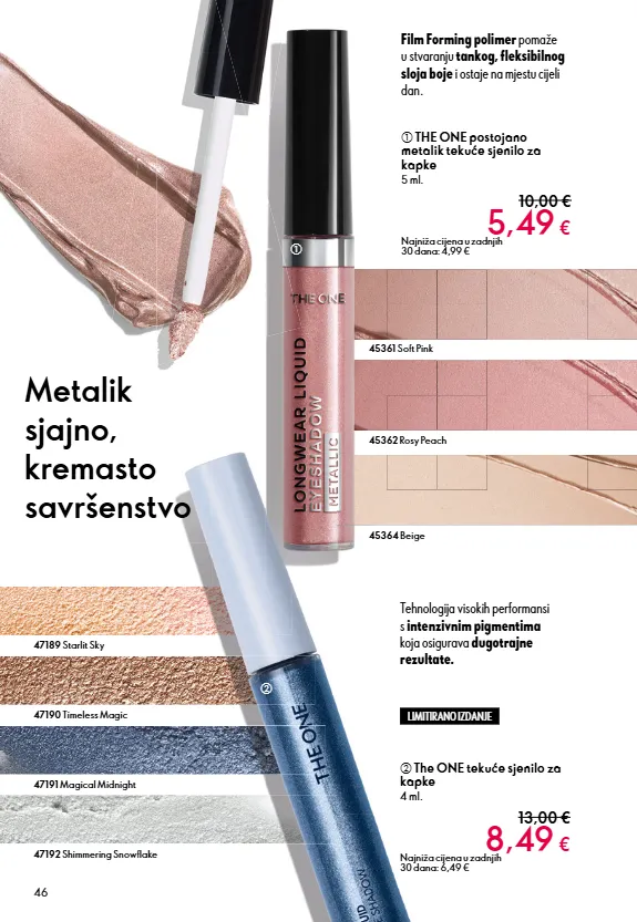 46 b The ONE tekuće sjenilo za kapke 4 ml. 13,00 € 8,49 € Najniža cijena u zadnjih 30 dana: 6,49 € a THE ONE postojano metalik tekuće sjenilo za kapke 5 ml. 10,00 € 5,49 € Najniža cijena u zadnjih 30 dana: 4,99 € Tehnologija visokih performansi s intenzivnim pigmentima koja osigurava dugotrajne rezultate. Film Forming polimer pomaže u stvaranju tankog, fleksibilnog sloja boje i ostaje na mjestu cijeli dan. 47192 Shimmering Snowflake 47190 Timeless Magic 47189 Starlit Sky Metalik sjajno, kremasto savršenstvo 47191 Magical Midnight LIMITIRANO IZDANJE 45364 Beige 45362 Rosy Peach 45361 Soft Pink a b