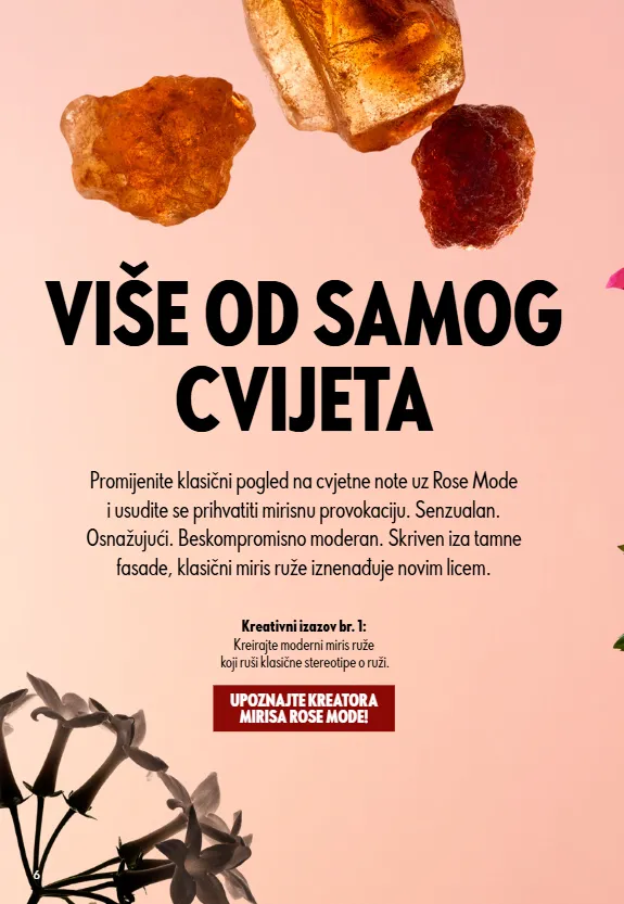 6 VIŠE OD SAMOG CVIJETA Promijenite klasični pogled na cvjetne note uz Rose Mode i usudite se prihvatiti mirisnu provokaciju. Senzualan. Osnažujući. Beskompromisno moderan. Skriven iza tamne fasade, klasični miris ruže iznenađuje novim licem. UPOZNAJTE KREATORA MIRISA ROSE MODE! Kreativni izazov br. 1: Kreirajte moderni miris ruže koji ruši klasične stereotipe o ruži.