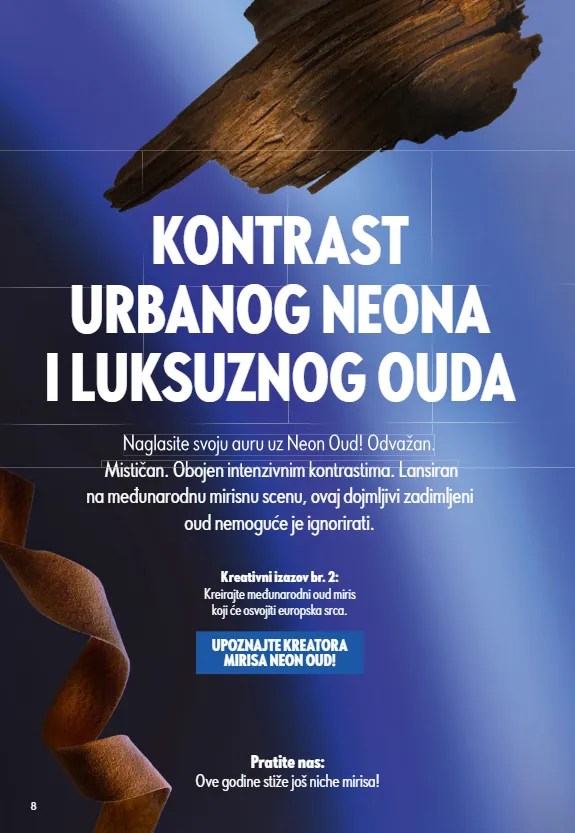 8 Naglasite svoju auru uz Neon Oud! Odvažan. Mističan. Obojen intenzivnim kontrastima. Lansiran na međunarodnu mirisnu scenu, ovaj dojmljivi zadimljeni oud nemoguće je ignorirati. Pratite nas: Ove godine stiže još niche mirisa! Naglasite svoju auru uz Neon Oud! Odvažan. Mističan. Obojen intenzivnim kontrastima. Lansiran KONTRAST URBANOG NEONA I LUKSUZNOG OUDA Kreativni izazov br. 2: Kreirajte međunarodni oud miris koji će osvojiti europska srca. UPOZNAJTE KREATORA MIRISA NEON OUD!