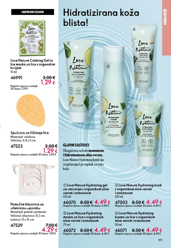 99 limitirano izdanje njega kože pamučne blazinice za višekratnu uporabu materijal: pamuk i poliester. veličina: blazinice: 8,3 cm, torbica: 13 x 15 cm. 47529 7,00 € 4,29 € najniža cijena u zadnjih 30 dana: 7,00 € spužvica za čišćenje lica materijal: celuloza. veličina: 6,8 x 5 cm. 47523 2,00 € 1,29 € najniža cijena u zadnjih 30 dana: 2,00 € c d b a love nature calming gel to ice maska za lice s organskim kivijem 10 ml. 46991 3,00 € 1,29 € najniža cijena u zadnjih 30 dana: 1,29 € a love nature hydrating gel za umivanje s organskom aloe verom i ananasom 125 ml. 46070 8,50 € 4,49 € najniža cijena u zadnjih 30 dana: 4,49 € d love nature hydrating krema za lice s organskom aloe verom i ananasom 50 ml. 46071 8,50 € 4,49 € najniža cijena u zadnjih 30 dana: 4,49 € c love nature hydrating maska za lice s organskom aloe verom i ananasom 75 ml. 46072 8,50 € 4,49 € najniža cijena u zadnjih 30 dana: 4,49 € b love nature hydrating tonik s organskom aloe verom i ananasom 150 ml. 47003 8,50 € 4,49 € najniža cijena u zadnjih 30 dana: 4,49 € hidratizirana koža blista! glavni sastojci obogaćena sočnim ananasom i hidratantnom aloe verom, love nature hydrating kolekcija osvježavajući je napitak za vašu kožu.