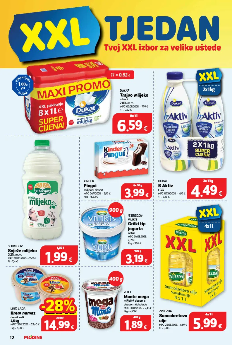 ‘z bregov svježe mlijeko 3,2% m.m. mpc 02.05.2025. = 2,42 € 1 l = 1,14 € ‘z bregov vilikis grčki tip jogurta natur mpc 04.08.2025. = 4,39 € 1 kg = 3,54 € zvijezda suncokretovo ulje mpc 23.06.2025. = 6,69 € 1 l = 1,50 € lino lada krem namaz duo ili milk 2,5 kg mpc 13.06.2025. = 22,40 € 1 kg = 6,00 € dukat trajno mlijeko u boci 2,8% m.m. mpc 02.05.2025. = 7,99 € 1 l = 0,82 € kinder pingui mliječni desert mpc 06.11.2025. = 3,99 € 1 kg = 16,63 € dukat b aktiv lgg mpc 09.10.2025. = 4,99 € 1 l = 2,25 € zott monte mega mliječni desert s okusom čokolade mpc 30.07.2025. = 2,45 € 1 kg = 4,73 € 5 5 . . 99 99 € 4x 1 l 4x 1 l xxl 2x 1 kg xxl 14 14 . . 99 99 € 2,5 kg 20.99 € -28% -28% 1 1 . . 99 99 € 1,75 l 3 3 . . 19 19 € 900 g 6 6 . . 59 59 € 8x 1 l 3 3 . . 99 99 € 8x 30 g 4 4 . . 49 49 € 2x 1 kg 1 1 . . 89 89 € 400 g 900 g 400 g 1 . 03 € /1 l 12