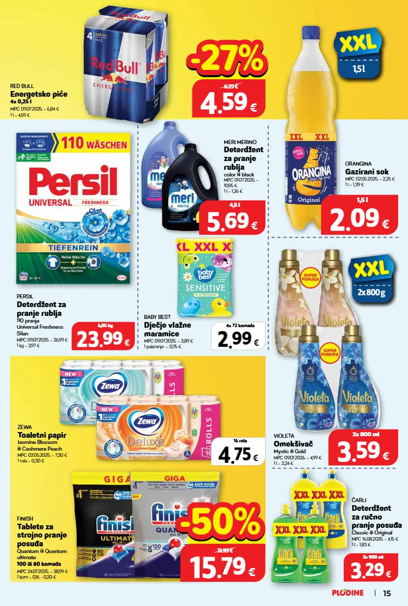 orangina gazirani sok mpc 02.05.2025. = 2,25 € 1 l = 1,39 € persil deterdžent za pranje rublja 110 pranja universal freshness silan mpc 09.07.2025. = 26,99 € 1 kg = 3,97 € 23 23 . . 99 99 € 6,05 kg meri merino deterdžent za pranje rublja color ili black mpc 01.07.2025. = 10,95 € 1 l = 1,26 € 5 5 . . 69 69 € 4,5 l violeta omekšivač mystic ili gold mpc 09.01.2026. = 4,99 € 1 l = 2,24 € 3 3 . . 59 59 € 2x 800 ml čarli deterdžent za ručno pranje posuđa classic ili original mpc 16.08.2025. = 4,15 € 1 l = 1,83 € 3 3 . . 29 29 € 2x 900 ml finish tablete za strojno pranje posuđa quantum ili quantum ultimate 100 ili 80 komada mpc 24.07.2025. = 38,99 € 1 kom = 0,16 - 0,20 € 15 15 . . 79 79 € 100 ili 80 komada 31.99 € -50% -50% red bull energetsko piće 4x 0,25 l mpc 09.07.2025. = 6,84 € 1 l = 4,59 € 4 4 . . 59 59 € 4x 0,25 l 6.29 € -27% -27% 2 2 . . 09 09 € 1,5 l 1,5 l xxl 2x 800 g xxl zewa toaletni papir jasmine blossom ili cashmere peach mpc 02.05.2025. = 7,30 € 1 rola = 0,30 € 4 4 . . 75 75 € 16 rola baby best dječje vlažne maramice mpc 09.07.2025. = 3,89 € 1 pakiranje = 0,75 € 2 2 . . 99 99 € 4x 72 komada 15