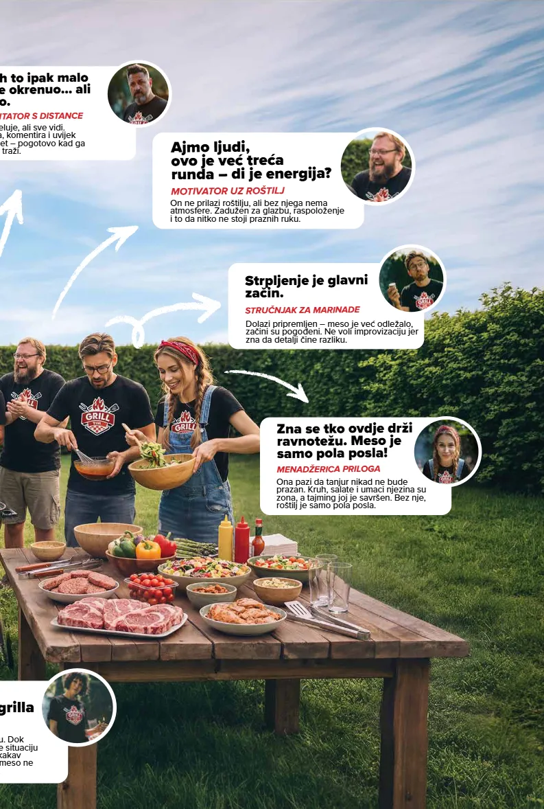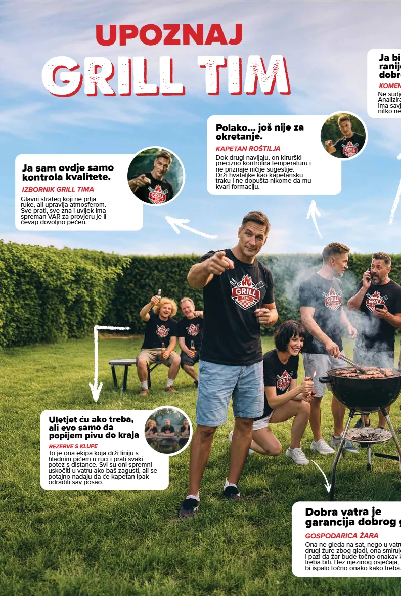 UPOZNAJ Dobra vatra je garancija dobrog g GOSPODARICA ŽARA Ja sam ovdje samo kontrola kvalitete. IZBORNIK GRILL TIMA Uletjet ću ako treba, ali evo samo da popijem pivu do kraja REZERVE S KLUPE Glavni strateg koji ne prlja ruke, ali upravlja atmosferom. Sve prati, sve zna i uvijek ima spreman VAR za provjeru je li ćevap dovoljno pečen. Polako… još nije za okretanje. KAPETAN ROŠTILJA Dok drugi navijaju, on kirurški precizno kontrolira temperaturu i ne priznaje ničije sugestije. Drži hvataljke kao kapetansku traku i ne dopušta nikome da mu kvari formaciju. Ja bih ranije dobro KOMEN Ne sudje Analizira ima savje nitko ne Ona ne gleda na sat, nego u vatru drugi žure zbog gladi, ona smiruje i pazi da žar bude točno onakav k treba biti. Bez njezinog osjećaja, m bi ispalo točno onako kako treba. To je ona ekipa koja drži liniju s hladnim pićem u ruci i prati svaki potez s distance. Svi su oni spremni uskočiti u vatru ako baš zagusti, ali se potajno nadaju da će kapetan ipak odraditi sav posao.