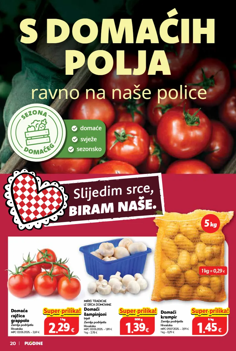 domaća rajčica grappolo zemlja podrijetla hrvatska mpc 02.05.2025. = 2,69 € top cijena! već od hit cijena! 2 2 . . 29 29 € 1 kg super prilika! super prilika! top cijena! već od hit cijena! 1 1 . . 39 39 € 500 g super prilika! super prilika! top cijena! već od hit cijena! 1 1 . . 45 45 € 5 kg super prilika! super prilika! 5 kg ravno na naše police s domaćih polja domaće svježe sezonsko d o m a ć e g s e z o n a slijedim srce, biram naše. 20 domaći krumpir zemlja podrijetla hrvatska mpc 09.07.2025. = 3,99 € 1 kg = 0,29 € miris tradicije iz srca domovine domaći šampinjoni bijeli zemlja podrijetla hrvatska mpc 02.05.2025. = 1,89 € 1 kg = 2,78 €