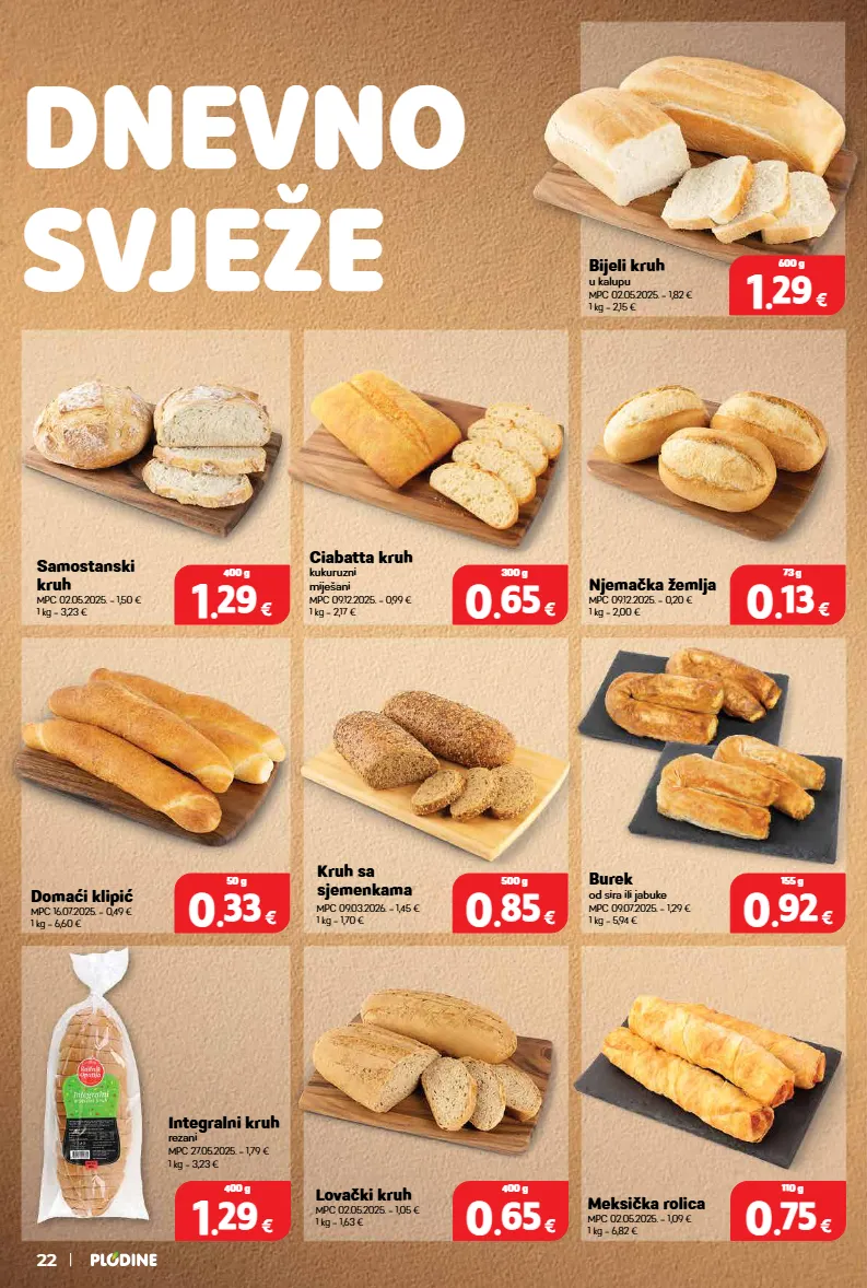 bijeli kruh u kalupu mpc 02.05.2025. = 1,82 € 1 kg = 2,15 € 1 1 . . 29 29 € 600 g kruh sa sjemenkama mpc 09.03.2026. = 1,45 € 1 kg = 1,70 € 0 0 . . 85 85 € 500 g samostanski kruh mpc 02.05.2025. = 1,50 € 1 kg = 3,23 € 1 1 . . 29 29 € 400 g ciabatta kruh kukuruzni miješani mpc 09.12.2025. = 0,99 € 1 kg = 2,17 € 0 0 . . 65 65 € 300 g njemačka žemlja mpc 09.12.2025. = 0,20 € 1 kg = 2,00 € 0 0 . . 13 13 € 73 g domaći klipić mpc 16.07.2025. = 0,49 € 1 kg = 6,60 € 0 0 . . 33 33 € 50 g 0 0 . . 92 92 € 155 g burek od sira ili jabuke mpc 09.07.2025. = 1,29 € 1 kg = 5,94 € 0 0 . . 75 75 € 110 g meksička rolica mpc 02.05.2025. = 1,09 € 1 kg = 6,82 € integralni kruh rezani mpc 27.05.2025. = 1,79 € 1 kg = 3,23 € 1 1 . . 29 29 € 400 g lovački kruh mpc 02.05.2025. = 1,05 € 1 kg = 1,63 € 0 0 . . 65 65 € 400 g dnevno svježe 22