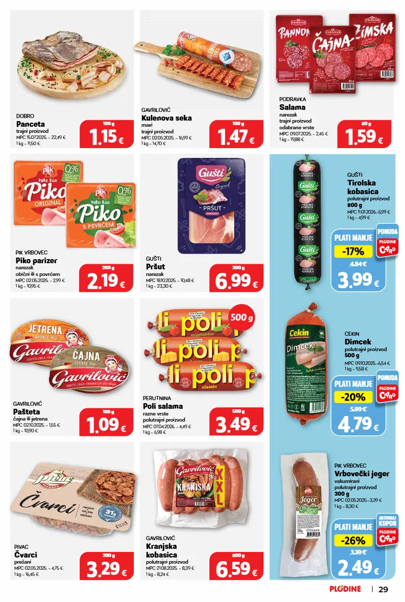 perutnina poli salama razne vrste polutrajni proizvod mpc 07.04.2026. = 4,49 € 1 kg = 6,98 € gavrilović pašteta čajna ili jetrena mpc 02.10.2025. = 1,55 € 1 kg = 10,90 € plati manje 4.84 € -17% -17% 3 3 . . 99 99 € ponuda gavrilović kulenova seka maxi trajni proizvod mpc 02.05.2025. = 16,99 € 1 kg = 14,70 € gušti tirolska kobasica polutrajni proizvod 800 g mpc 11.01.2026.=5,99 € 1 kg = 4,99 € 3 3 . . 49 49 € 500 g 1 1 . . 09 09 € 100 g 1 1 . . 47 47 € 100 g 500 g dobro panceta trajni proizvod mpc 15.07.2025. = 22,49 € 1 kg = 11,50 € 1 1 . . 15 15 € 100 g pivac čvarci prešani mpc 02.05.2025. = 4,75 € 1 kg = 16,45 € 3 3 . . 29 29 € 200 g gavrilović kranjska kobasica polutrajni proizvod mpc 21.08.2025. = 8,39 € 1 kg = 8,24 € pik vrbovec piko parizer narezak obični ili s povrćem mpc 02.05.2025. = 2,99 € 1 kg = 10,95 € gušti pršut narezak mpc 18.10.2025. = 10,48 € 1 kg = 23,30 € 6 6 . . 59 59 € 800 g plati manje 5.99 € -20% -20% 4 4 . . 79 79 € ponuda cekin dimcek polutrajni proizvod 500 g mpc 09.10.2025.=6,54 € 1 kg = 9,58 € 6 6 . . 99 99 € 300 g plati manje 3.39 € -26% -26% 2 2 . . 49 49 € aktiviraj kupon pik vrbovec vrbovečki jeger vakumirani polutrajni proizvod 300 g mpc 02.05.2025.=3,39 € 1 kg = 8,30 € 2 2 . . 19 19 € 200 g podravka salama narezak trajni proizvod odabrane vrste mpc 09.07.2025. = 2,45 € 1 kg = 19,88 € 1 1 . . 59 59 € 80 g 29
