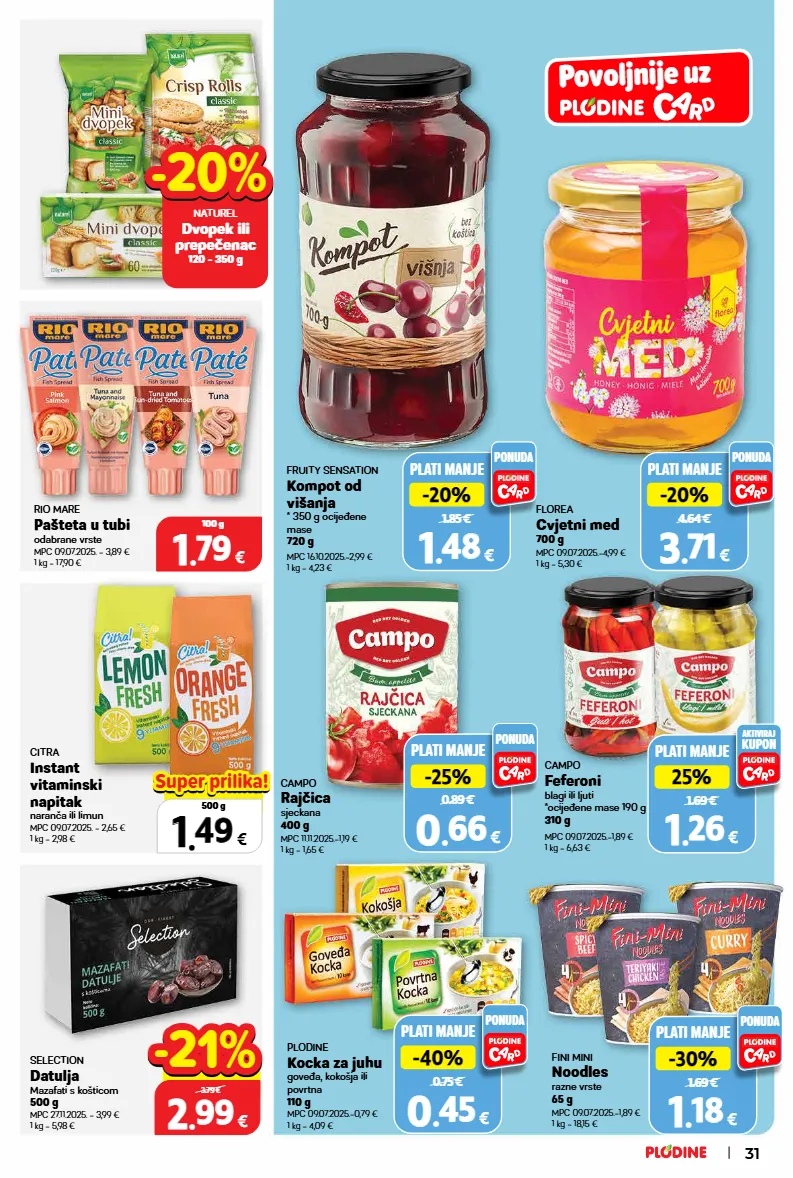 plati manje 0.89 € -25% -25% 0 0 . . 66 66 € ponuda campo rajčica sjeckana 400 g mpc 11.11.2025.=1,19 € 1 kg = 1,65 € plati manje 1.69 € -30% -30% 1 1 . . 18 18 € ponuda fini mini noodles razne vrste 65 g mpc 09.07.2025.=1,89 € 1 kg = 18,15 € plati manje 1.85 € -20% -20% 1 1 . . 48 48 € ponuda campo feferoni blagi ili ljuti *ocijeđene mase 190 g 310 g mpc 09.07.2025.=1,89 € 1 kg = 6,63 € fruity sensation kompot od višanja * 350 g ocijeđene mase 720 g mpc 16.10.2025.=2,99 € 1 kg = 4,23 € plati manje 1.69 € 25% 25% 1 1 . . 26 26 € aktiviraj kupon naturel dvopek ili prepečenac 120 - 350 g -20% -20% selection datulja mazafati s košticom 500 g mpc 27.11.2025. = 3,99 € 1 kg = 5,98 € plati manje 4.64 € -20% -20% 3 3 . . 71 71 € ponuda plati manje 0.75 € -40% -40% 0 0 . . 45 45 € ponuda florea cvjetni med 700 g mpc 09.07.2025.=4,99 € 1 kg = 5,30 € plodine kocka za juhu goveđa, kokošja ili povrtna 110 g mpc 09.07.2025.=0,79 € 1 kg = 4,09 € 2 2 . . 99 99 € 500 g 3.79 € -21% -21% citra instant vitaminski napitak naranča ili limun mpc 09.07.2025. = 2,65 € 1 kg = 2,98 € top cijena! već od hit cijena! 1 1 . . 49 49 € 500 g super prilika! super prilika! povoljnije uz 1 1 . . 79 79 € 100 g rio mare pašteta u tubi odabrane vrste mpc 09.07.2025. = 3,89 € 1 kg = 17,90 € 31