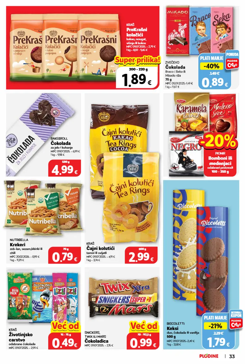 plati manje 2.29 € -21% -21% 1 1 . . 79 79 € aktiviraj kupon biscoletti keksi duo, čokolada ili vanilija 500 g mpc 09.07.2025.=2,49 € 1 kg = 3,58 € nutribella krekeri zob-lan, sezam,kikiriki ili chili mpc 20.02.2026. = 0,99 € 1 kg = 11,29 € snickers, twix ili mars čokoladica mpc 09.07.2025. = 2,15 € kraš životinjsko carstvo odabrane čokolade mpc 09.07.2025. = 2,99 € plati manje 1.49 € -40% -40% 0 0 . . 89 89 € ponuda bake&roll čokolada za jelo i kuhanje mpc 09.07.2025. = 6,99 € 1 kg = 9,98 € kraš čajni kolutići tamni ili svijetli mpc 09.07.2025. = 4,19 € 1 kg = 3,74 € pionir bomboni ili medenjaci odabrani proizvodi 100 - 250 g -20% -20% 0 0 . . 79 79 € 70 g top cijena! već od hit cijena! 0 0 . . 99 99 € 70 - 112,5 g već od već od top cijena! već od hit cijena! 0 0 . . 49 49 € 15 - 75 g već od već od kraš prekrašni kolačići kakao, nougat, višnja ili kokos mpc 09.07.2025. = 2,79 € 1 kg = 8,59 - 9,45 € 4 4 . . 99 99 € 500 g 2 2 . . 99 99 € 800 g top cijena! već od hit cijena! 1 1 . . 89 89 € 200 - 220 g super prilika! super prilika! 33