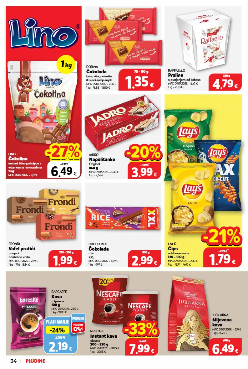 nescafe instant kava classic 200 - 220 g mpc 25.11.2025. = 10,99 € 1 kg = 39,95 € jubilarna mljevena kava mpc 09.07.2025. = 9,19 € 1 kg = 16,23 € lino čokolino instant žitne pahuljice s vitaminima i mineralima 1 kg mpc 09.07.2025. = 9,69 € raffaello praline s punjenjem od kokosa mpc 09.07.2025. = 6,49 € 1 kg = 20,83 € lay’s čips odabrane vrste 120 - 130 g mpc 09.07.2025. = 2,49 € 1 kg = 13,77 - 14,92 € frondi vafel prutići punjeni odabrane vrste mpc 09.07.2025. = 2,79 € 1 kg = 7,96 - 8,84 € dorina čokolada keks, riža, noisette ili sjeckani lješnjak mpc 09.07.2025. = 2,05 € 1 kg = 16,88 - 18,00 € jadro napolitanke original 860 g mpc 09.07.2025. = 5,45 € 1 kg = 4,64 € 4 4 . . 79 79 € 230 g 1 kg 6 6 . . 49 49 € 1 kg 8.99 € -27% -27% 1 1 . . 79 79 € 1 l 2.29 € -21% -21% 7 7 . . 99 99 € 200 - 220 g 11.99 € -33% -33% 6 6 . . 49 49 € 400 g 1 1 . . 99 99 € 225 - 250 g 1 1 . . 35 35 € 75 - 80 g 3 3 . . 99 99 € 860 g 4.99 € -20% -20% choco rice čokolada riža xxl mpc 09.07.2025. = 4,99 € 1 kg = 9,97 € 2 2 . . 99 99 € 300 g plati manje 2.89 € -24% -24% 2 2 . . 19 19 € ponuda barcaffe kava mljevena 100 g mpc 25.11.2025.=2,89 € 1 kg = 21,90 € 34