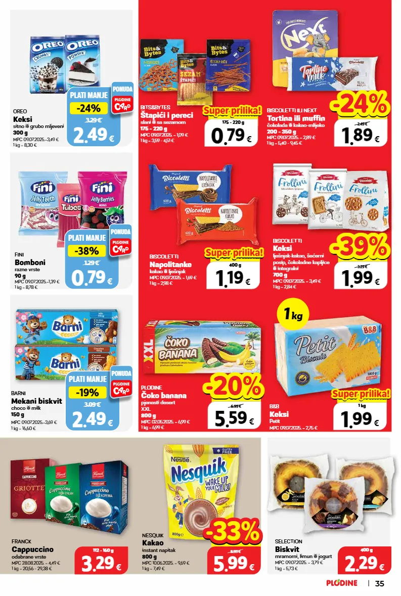 b&b keksi petit mpc 09.07.2025. = 2,75 € biscoletti keksi lješnjak-kakao, šećerni posip, čokoladne kapljice ili integralni 700 g mpc 09.07.2025. = 3,49 € 1 kg = 2,84 € biscoletti napolitanke kakao ili lješnjak mpc 09.07.2025. = 1,69 € 1 kg = 2,98 € plodine čoko banana pjenasti desert xxl 800 g mpc 02.05.2025. = 6,99 € 1 kg = 6,99 € bits&bytes štapići i pereci slani ili sa sezamom 175 - 220 g mpc 09.07.2025. = 1,09 € 1 kg = 3,59 - 4,51 € biscoletti ili next tortina ili muffin čokolada ili kakao-mlijeko 200 - 350 g mpc 09.07.2025. = 2,89 € 1 kg = 5,40 - 9,45 € top cijena! već od hit cijena! 0 0 . . 79 79 € 175 - 220 g super prilika! super prilika! top cijena! već od hit cijena! 1 1 . . 19 19 € 400 g super prilika! super prilika! top cijena! već od hit cijena! 1 1 . . 99 99 € 1 kg super prilika! super prilika! 1 1 . . 89 89 € xxxxx 2.49 € -24% -24% 1 1 . . 99 99 € xxxxx 3.29 € -39% -39% 5 5 . . 59 59 € xxxxx 6.99 € -20% -20% franck cappuccino odabrane vrste mpc 28.08.2025. = 4,49 € 1 kg = 20,56 - 29,38 € nesquik kakao instant napitak 800 g mpc 10.06.2025. = 9,69 € 1 kg = 7,49 € selection biskvit mramorni, limun ili jogurt mpc 09.07.2025. = 3,79 € 1 kg = 5,73 € 3 3 . . 29 29 € 112 - 160 g 5 5 . . 99 99 € 800 g 8.99 € -33% -33% plati manje 3.29 € -24% -24% 2 2 . . 49 49 € ponuda oreo keksi sitno ili grubo mljeveni 300 g mpc 09.07.2025.=3,49 € 1 kg = 8,30 € plati manje 1.29 € -38% -38% 0 0 . . 79 79 € ponuda fini bomboni razne vrste 90 g mpc 09.07.2025.=1,39 € 1 kg = 8,78 € 2 2 . . 29 29 € 400 g plati manje 3.09 € -19% -19% 2 2 . . 49 49 € ponuda barni mekani biskvit choco ili milk 150 g mpc 09.07.2025.=3,69 € 1 kg = 16,60 € 1 kg 35