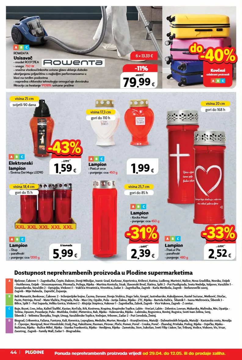 elektronski lampion • smirna dei maja led90 a b c lampion • stup • parafinski • punjenje: cca 1200 g a b c lampion • kocka maxi • punjenje: cca 450 g a b c lampion • paxlui pia • parafinski • punjenje: 480 g a b c lampion • paxlui srce • punjenje: cca 450 g a b c 1 1 . . 99 99 € 5 5 . . 99 99 € 6 komada visina 25 cm svijetli 90 dana visina 18,4 cm gori do 15 h visina 20 cm gori do 168 h visina 17,3 cm gori do 110 h visina 25,7 cm gori do 85 h 2 2 . . 52 52 € 3.79 € -33% -33% 2 2 . . 39 39 € 3.49 € -31% -31% 1 1 . . 59 59 € 2.79 € -43% -43% 79 79 . . 99 99 € -11% -11% 89.99 € rowenta usisavač • model ro3721ea • snaga: 750 w • snažna visokoučinkovita usisna glava uklanja duboko ukorijenjenu prljavštinu s najboljim performansama u klasi na tvrdim podovima • napredna ciklonska tehnologija omogućuje dvostruku filtraciju za hvatanje 99,98% usisane prašine a b c do do kovčezi odabrani proizvodi -40% -40% a b c ponuda neprehrambenih proizvoda vrijedi od 29.04. do 12.05. ili do prodaje zaliha. beli manastir, benkovac, čakovec 2 - inženjerijske bojne, čazma, daruvar, donja stubica, dugo selo, gospić, jastrebarsko, kukuljanovo, kastel sućurac, metković, otočac, pazin, petrinja, poreč - mate vlašića, pregrada, pula - max city, ogulin, pula - jurija žakna, rijeka - ztc, rijeka - bartola kašića, šibenik 1 - ivana meštrovića, šibenik 3 - bilice, split 1 - put supavla, velika gorica, vinkovci 2 - alojzija stepinca, vukovar 1 - zagrebačka, zabok, zagreb - vice vukova, zagreb - z centar. b buje, buzet, cres, jelsa, kaštel štafilić, kastav, korčula, krk, kostrena, krapina, krapinske toplice, labin - vrećari, labin - zelenice, lovran, makarska, malinska, nin, opatija - tošina, opuzen, posedarje, pula - mutilska, orebić, pleternica, rab, rijeka - vukovarska, rijeka - labinska, rogoznica, rovinj, rugvica, sveti ivan zelina, senj, šibenik 2 - velimira škorpika, trogir, umag, varaždinske toplice, vodnjan, vrbovec, zadar 2 - put cerodola, žminj. c biograd, crikvenica, fažana, funtana, kali, korenica, lepoglava, medulin, murter, novalja 1 - kranjčevićeva, matulji - dalmatinskih brigada, matulji - kastavska cesta, novalja 2 - čiponjac, novigrad, novi vinodolski, ozalj, pag, pakoštane, pasman, pirovac, ploče, pomer, poreč - creska, poreč - zbandaj, privlaka, prelog, rijeka - osječka, rijeka - ružićeva, rijeka - ružice mihić, rijeka - stanka frankovića, rijeka - verdijeva, rijeka - zametska, ston, sukošan, sveti filip i jakov, tar, tribunj, vodice, viskovo, vis, vrsar, zaostrog, zagreb - family mall, zadar 1 - biogradska. d a bjelovar, čakovec 1 - zagrebačka, čepin, đakovo, donji miholjac, ivanic grad, karlovac, koprivnica, križevci, kutina, ludbreg, marinici, našice, nova gradiška, novska, osijek - huttlerova, osijek - strossmayerova, pitomača, požega, rijeka - martina kontuša, sisak, slavonski brod, slatina, split 2 - put pazdigrada, sveta nedelja, valpovo, varaždin 1 - gospodarska, varaždin 2 - optujska, vinkovci 1 - vukčića hrvatinića, virovitica, zadar 3 - zagrebačka, zagreb - karla metikoša, zagreb - stefanovečki zavoj, zagreb - mije haleuša, zaprešić, županja. dostupnost neprehrambenih proizvoda u plodine supermarketima 44
