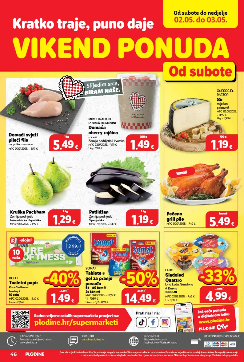 još veća ponuda u digitalnom letku www.plodine.hr radno vrijeme ostalih supermarketa provjeri na: plodine.hr/supermarketi od subote do nedjelje 02.05. do 03.05. vikend ponuda od subote kratko traje, puno daje dolli toaletni papir pure softness troslojni 10 rola mpc 02.05.2025. = 2,49 € 1 rola = 0,15 € 1 1 . . 49 49 € 10 rola 2.49 € -40% -40% somat tablete ili gel za pranje posuđa 54 - 80 kom ili 2x 684 ml mpc 09.07.2025. = 31,29 € 1 l = 10,59 € 1 kom = 0,17 - 0,27 € ledo sladoled quattro lino lada, sunshine ili dorina 1500 ml mpc 02.05.2025. = 7,49 € 1 l = 3,33 € 14 14 . . 49 49 € 54 - 80 kom; 2x 684 ml 28.99 € -50% -50% 4 4 . . 99 99 € 1500 ml 7.49 € -33% -33% quesos el pastor sir miješani polutvrdi mpc 02.05.2025. = 14,99 € 1 kg = 11,90 € pečeno grill pile mpc 09.07.2025. = 7,49 € 5 5 . . 49 49 € komad komad 1 1 . . 19 19 € 100 g domaći svježi pileći file na pultu mesnice mpc 09.07.2025. = 8,99 € 5 5 . . 49 49 € 1 kg miris tradicije iz srca domovine domaća cherry rajčica u čaši zemlja podrijetla hrvatska mpc 23.07.2025. = 1,99 € 1 kg = 2,98 € kruška packham zemlja podrijetla južnoafrička republika mpc 27.05.2025. = 1,99 € patlidžan zemlja podrijetla španjolska mpc 17.12.2025. = 3,49 € 1 1 . . 49 49 € 200 g 1 1 . . 29 29 € 1 kg 1 1 . . 19 19 € 1 kg -slojni 3 10 rola slijedim srce, biram naše. 46