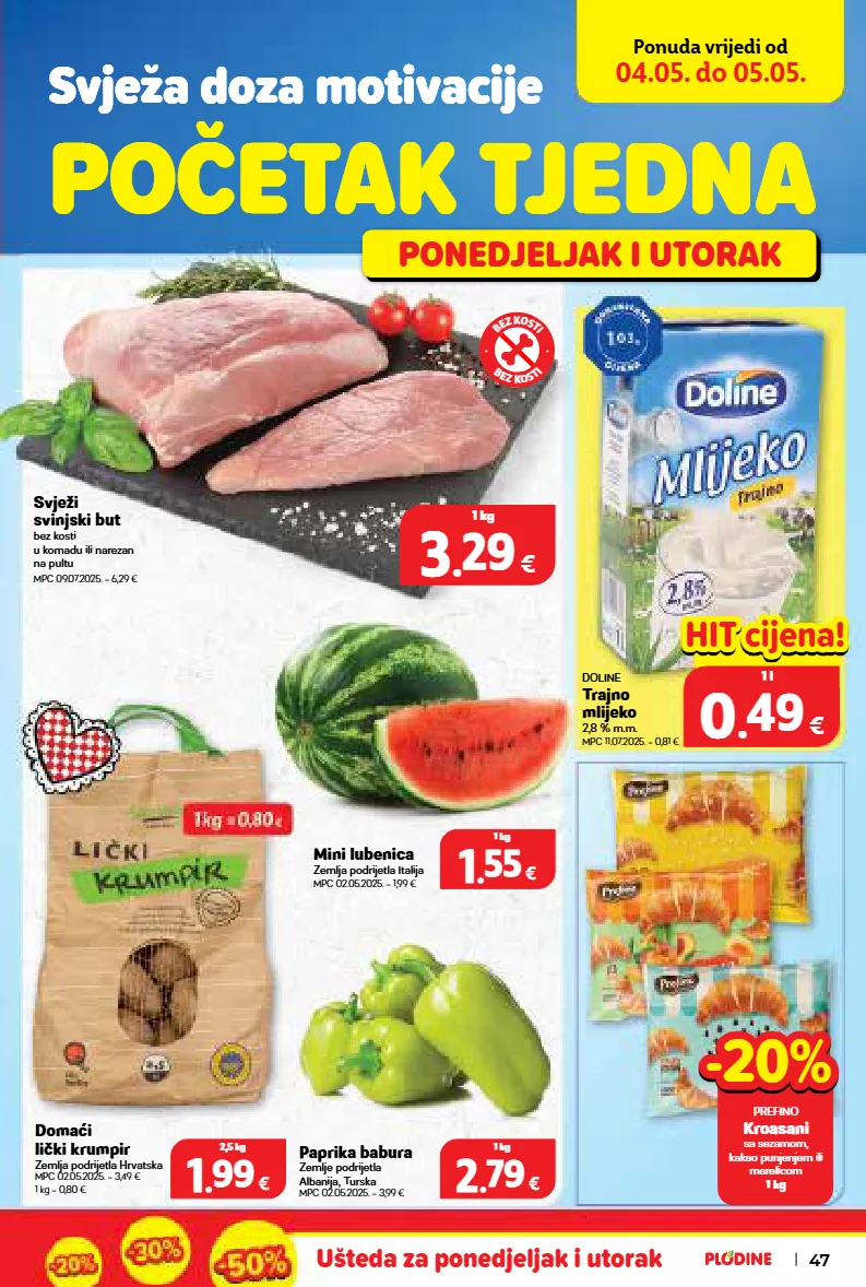 početak tjedna svježa doza motivacije ponedjeljak i utorak ponuda vrijedi od 04.05. do 05.05. ušteda za ponedjeljak i utorak prefino kroasani sa sezamom, kakao punjenjem ili marelicom 1 kg -20% -20% doline trajno mlijeko 2,8 % m.m. mpc 11.07.2025. = 0,81 € paprika babura zemlje podrijetla albanija, turska mpc 02.05.2025. = 3,99 € domaći lički krumpir zemlja podrijetla hrvatska mpc 02.05.2025. = 3,49 € 1 kg = 0,80 € svježi svinjski but bez kosti u komadu ili narezan na pultu mpc 09.07.2025. = 6,29 € 3 3 . . 29 29 € 1 kg mini lubenica zemlja podrijetla italija mpc 02.05.2025. = 1,99 € 1 1 . . 55 55 € 1 kg 1 1 . . 99 99 € 2,5 kg 2 2 . . 79 79 € 1 kg top cijena! već od hit cijena! 0 0 . . 49 49 € 1 l hit hit cijena! cijena! početak tjedna svježa doza motivacije ponedjeljak i utorak b e z k o s t i b e z k o s t i 47