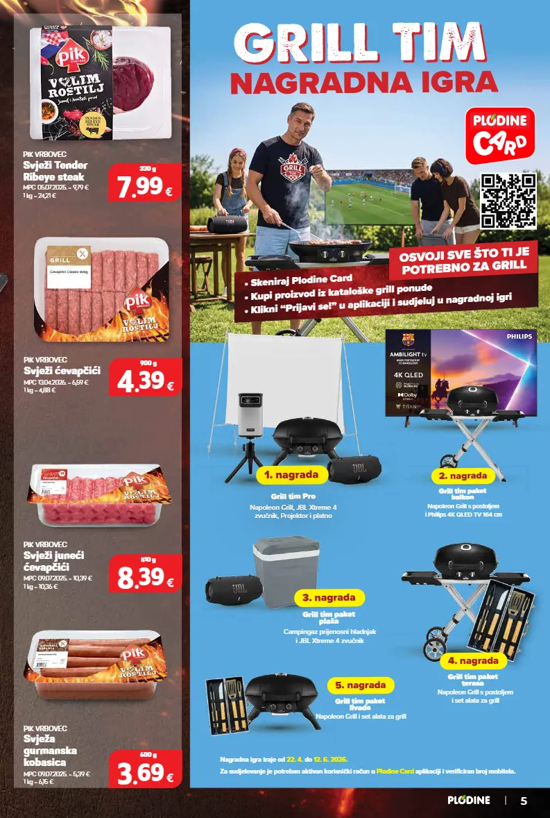 pik vrbovec svježi tender ribeye steak mpc 05.07.2025. = 9,79 € 1 kg = 24,21 € 7 7 . . 99 99 € 330 g pik vrbovec svježi juneći ćevapčići mpc 09.07.2025. = 10,39 € 1 kg = 10,36 € 8 8 . . 39 39 € 810 g pik vrbovec svježa gurmanska kobasica mpc 09.07.2025. = 5,39 € 1 kg = 6,15 € 3 3 . . 69 69 € 600 g pik vrbovec svježi ćevapčići mpc 13.04.2026. = 6,59 € 1 kg = 4,88 € 4 4 . . 39 39 € 900 g osvoji sve što ti je potrebno za grill 1. nagrada • skeniraj plodine card • kupi proizvod iz kataloške grill ponude • klikni “prijavi se!” u aplikaciji i sudjeluj u nagradnoj igri za sudjelovanje je potreban aktivan korisnički račun u plodine card aplikaciji i verificiran broj mobitela. nagradna igra traje od 22. 4. do 12. 6. 2026. 2. nagrada grill tim paket balkon napoleon grill s postoljem i philips 4k qled tv 164 cm 5. nagrada grill tim paket livada napoleon grill i set alata za grill 4. nagrada grill tim paket terasa napoleon grill s postoljem i set alata za grill 3. nagrada grill tim paket plaža campingaz prijenosni hladnjak i jbl xtreme 4 zvučnik grill tim pro napoleon grill, jbl xtreme 4 zvučnik, projektor i platno nagradna igra 5
