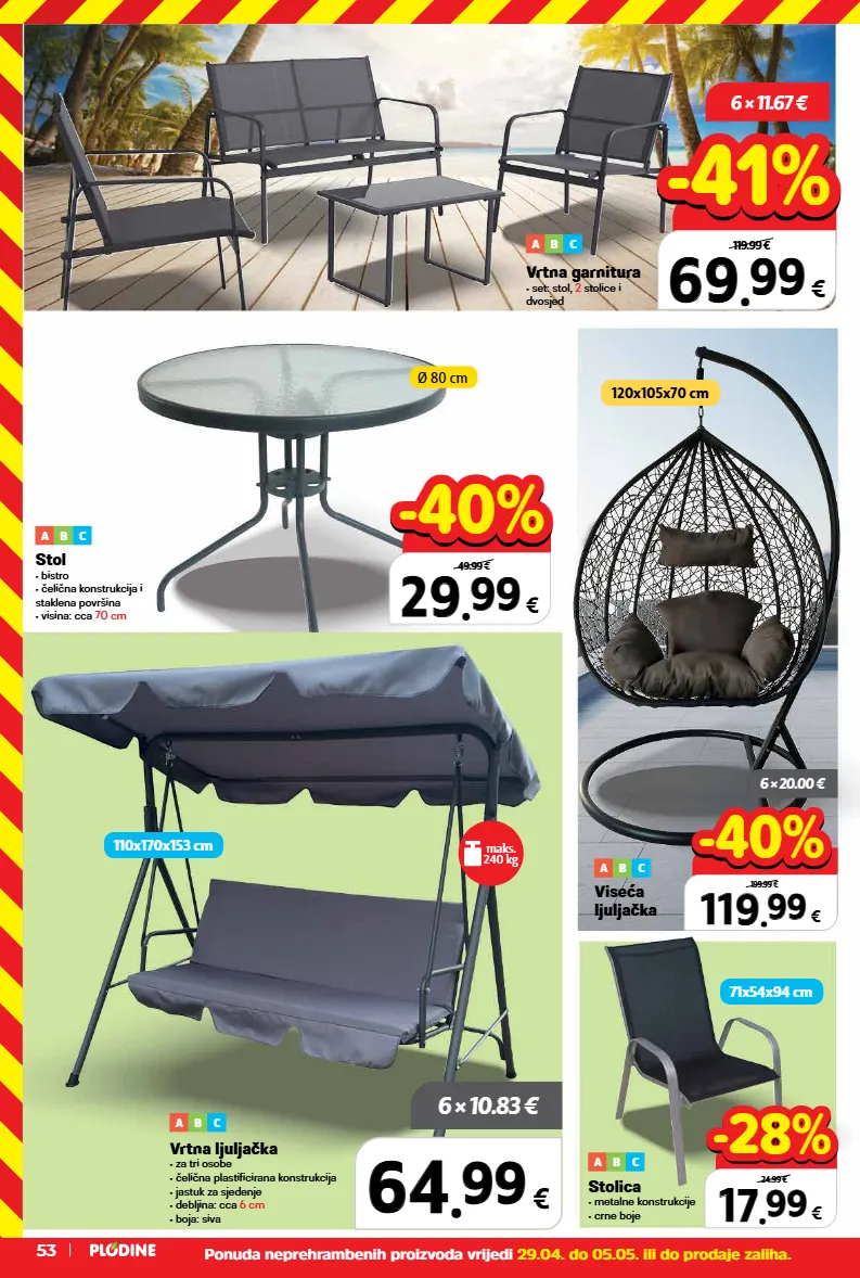 viseća ljuljačka a b c vrtna ljuljačka • za tri osobe • čelična plastificirana konstrukcija • jastuk za sjedenje • debljina: cca 6 cm • boja: siva a b c vrtna garnitura • set: stol, 2 stolice i dvosjed a b c stol • bistro • čelična konstrukcija i staklena površina • visina: cca 70 cm a b c stolica • metalne konstrukcije • crne boje a b c 64 64 . . 99 99 € 6 × 10.83 € 69 69 . . 99 99 € 119.99 € -41% -41% 6 × 11.67 € 17 17 . . 99 99 € 24.99 € -28% -28% 29 29 . . 99 99 € 49.99 € -40% -40% 119 119 . . 99 99 € 199.99 € -40% -40% 6 × 20.00 € ponuda neprehrambenih proizvoda vrijedi od 22.04. do 05.05. ili do prodaje zaliha. 110x170x153 cm 120x105x70 cm 71x54x94 cm maks. 240 kg ø 80 cm ponuda neprehrambenih proizvoda vrijedi 29.04. do 05.05. ili do prodaje zaliha. 53
