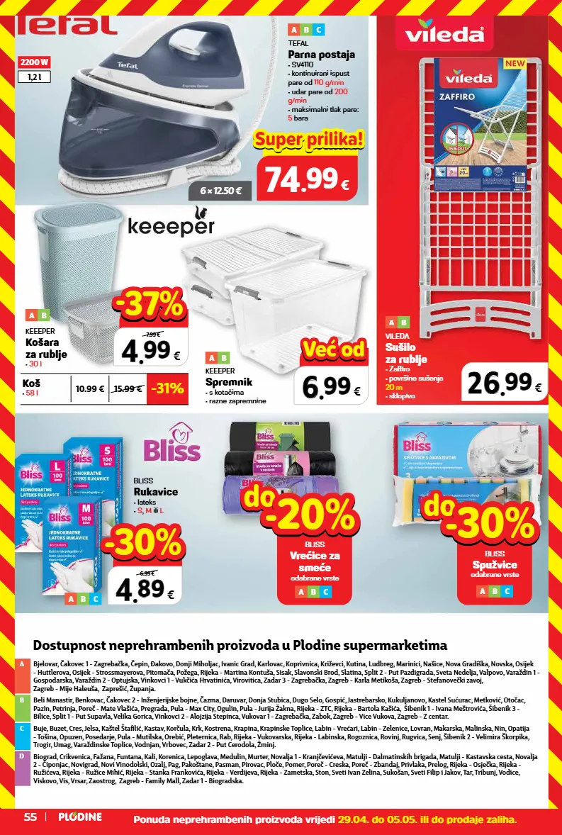 bliss rukavice • lateks • s, m ili l 26 26 . . 99 99 € tefal parna postaja • sv4110 • kontinuirani ispust pare od 110 g/min • udar pare od 200 g/min • maksimalni tlak pare: 5 bara a b c keeeper košara za rublje • 30 l a b vileda sušilo za rublje • zaffiro • površine sušenja 20 m • sklopivo a b keeeper spremnik • s kotačima • razne zapremnine a b top cijena! već od hit cijena! 74 74 . . 99 99 € super prilika! super prilika! 6 × 12.50 € 4 4 . . 89 89 € 6.99 € -30% -30% a b c do do bliss spužvice odabrane vrste -30% -30% a b c do do bliss vrećice za smeće odabrane vrste -20% -20% a b c -31% 10.99 € 15.99 € koš • 58 l 4 4 . . 99 99 € xxxxx 7.99 € -37% -37% 6 6 . . 99 99 € već od već od ponuda neprehrambenih proizvoda vrijedi od 22.04. do 05.05. ili do prodaje zaliha. 2200 w 1,2 l beli manastir, benkovac, čakovec 2 - inženjerijske bojne, čazma, daruvar, donja stubica, dugo selo, gospić, jastrebarsko, kukuljanovo, kastel sućurac, metković, otočac, pazin, petrinja, poreč - mate vlašića, pregrada, pula - max city, ogulin, pula - jurija žakna, rijeka - ztc, rijeka - bartola kašića, šibenik 1 - ivana meštrovića, šibenik 3 - bilice, split 1 - put supavla, velika gorica, vinkovci 2 - alojzija stepinca, vukovar 1 - zagrebačka, zabok, zagreb - vice vukova, zagreb - z centar. b buje, buzet, cres, jelsa, kaštel štafilić, kastav, korčula, krk, kostrena, krapina, krapinske toplice, labin - vrećari, labin - zelenice, lovran, makarska, malinska, nin, opatija - tošina, opuzen, posedarje, pula - mutilska, orebić, pleternica, rab, rijeka - vukovarska, rijeka - labinska, rogoznica, rovinj, rugvica, senj, šibenik 2 - velimira škorpika, trogir, umag, varaždinske toplice, vodnjan, vrbovec, zadar 2 - put cerodola, žminj. c biograd, crikvenica, fažana, funtana, kali, korenica, lepoglava, medulin, murter, novalja 1 - kranjčevićeva, matulji - dalmatinskih brigada, matulji - kastavska cesta, novalja 2 - čiponjac, novigrad, novi vinodolski, ozalj, pag, pakoštane, pasman, pirovac, ploče, pomer, poreč - creska, poreč - zbandaj, privlaka, prelog, rijeka - osječka, rijeka - ružićeva, rijeka - ružice mihić, rijeka - stanka frankovića, rijeka - verdijeva, rijeka - zametska, ston, sveti ivan zelina, sukošan, sveti filip i jakov, tar, tribunj, vodice, viskovo, vis, vrsar, zaostrog, zagreb - family mall, zadar 1 - biogradska. d a bjelovar, čakovec 1 - zagrebačka, čepin, đakovo, donji miholjac, ivanic grad, karlovac, koprivnica, križevci, kutina, ludbreg, marinici, našice, nova gradiška, novska, osijek - huttlerova, osijek - strossmayerova, pitomača, požega, rijeka - martina kontuša, sisak, slavonski brod, slatina, split 2 - put pazdigrada, sveta nedelja, valpovo, varaždin 1 - gospodarska, varaždin 2 - optujska, vinkovci 1 - vukčića hrvatinića, virovitica, zadar 3 - zagrebačka, zagreb - karla metikoša, zagreb - stefanovečki zavoj, zagreb - mije haleuša, zaprešić, županja. dostupnost neprehrambenih proizvoda u plodine supermarketima ponuda neprehrambenih proizvoda vrijedi 29.04. do 05.05. ili do prodaje zaliha. 55