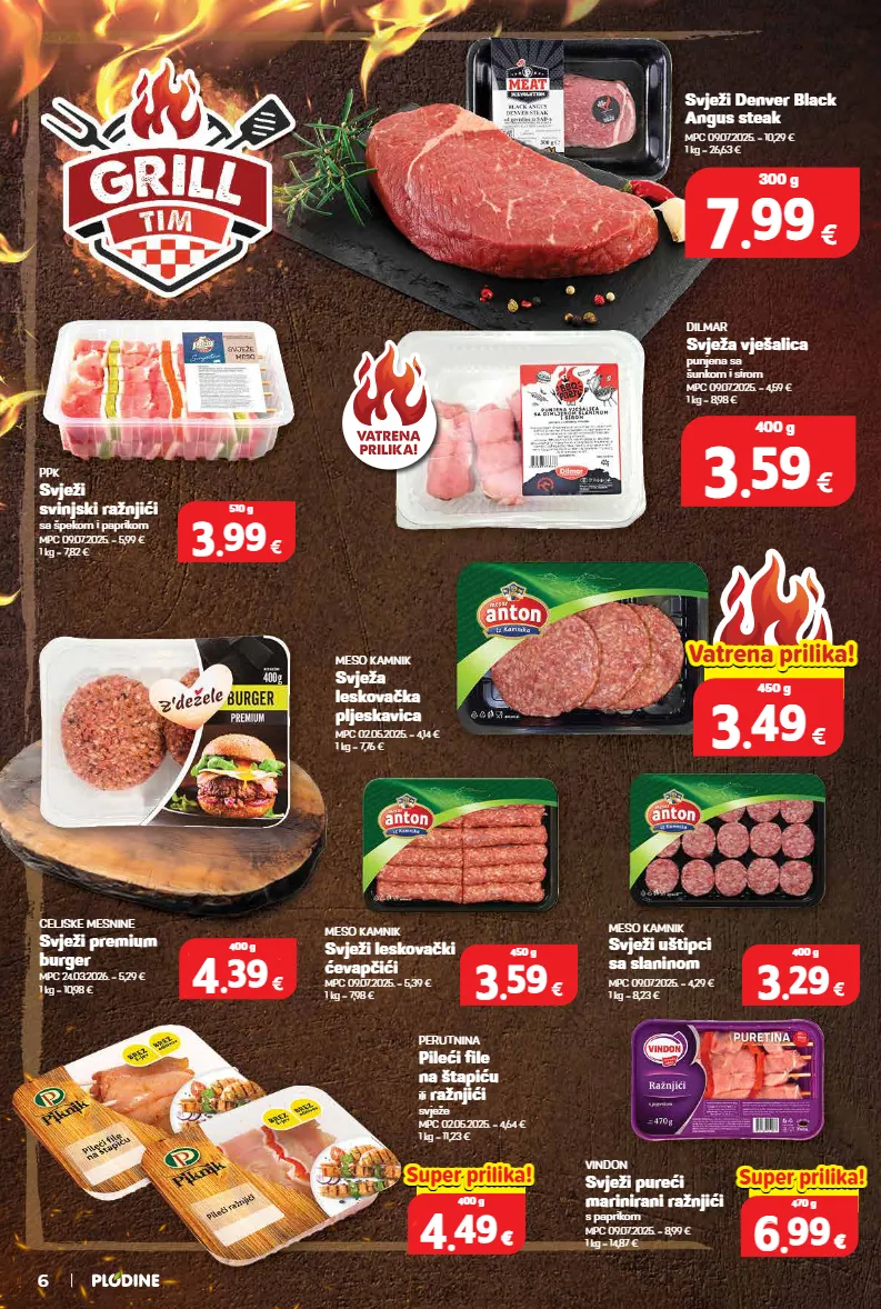 vindon svježi pureći marinirani ražnjići s paprikom mpc 09.07.2025. = 8,99 € 1 kg = 14,87 € perutnina pileći file na štapiću ili ražnjići svježe mpc 02.05.2025. = 4,64 € 1 kg = 11,23 € svježi denver black angus steak mpc 09.07.2025. = 10,29 € 1 kg = 26,63 € 7 7 . . 99 99 € 300 g celjske mesnine svježi premium burger mpc 24.03.2026. = 5,29 € 1 kg = 10,98 € 4 4 . . 39 39 € 400 g meso kamnik svježi leskovački ćevapčići mpc 09.07.2025. = 5,39 € 1 kg = 7,98 € 3 3 . . 59 59 € 450 g 3 3 . . 29 29 € 400 g meso kamnik svježa leskovačka pljeskavica mpc 02.05.2025. = 4,14 € 1 kg = 7,76 € meso kamnik svježi uštipci sa slaninom mpc 09.07.2025. = 4,29 € 1 kg = 8,23 € dilmar svježa vješalica punjena sa šunkom i sirom mpc 09.07.2025. = 4,59 € 1 kg = 8,98 € 3 3 . . 59 59 € 400 g ppk svježi svinjski ražnjići sa špekom i paprikom mpc 09.07.2025. = 5,99 € 1 kg = 7,82 € 3 3 . . 99 99 € 510 g top cijena! već od hit cijena! 3 3 . . 49 49 € 450 g vatrena prilika! vatrena prilika! top cijena! već od hit cijena! 6 6 . . 99 99 € € 470 g super prilika! super prilika! top cijena! već od hit cijena! 4 4 . . 49 49 € € 400 g super prilika! super prilika! 6
