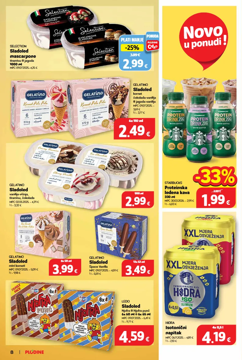 gelatino sladoled mini korneti mpc 09.07.2025. = 5,09 € 1 l = 9,98 € gelatino sladoled kornet čokolada-vanilija ili jagoda-vanilija mpc 09.07.2025. = 3,69 € 1 l = 3,77 € ledo sladoled njofra ili njofra punč 6x 60 ml ili 6x 65 ml mpc 09.07.2025. = 6,49 € 1 l = 11,77 € gelatino sladoled vanilija-višnja, tiramisu, čokolada mpc 02.05.2025. = 4,29 € 1 l = 3,32 € gelatino sladoled space vanilla mpc 09.07.2025. = 4,59 € 1 l = 5,59 € 3 3 . . 49 49 € 12x 52 ml 3 3 . . 99 99 € 8x 50 ml 2 2 . . 49 49 € 6x 110 ml 4 4 . . 59 59 € hidra isotonični napitak mpc 06.11.2025. = 4,89 € 1 l = 2,10 € 4 4 . . 19 19 € 4x 0,5 l starbucks proteinska ledena kava 330 ml mpc 30.03.2026. = 2,99 € 1 l = 6,03 € plati manje 3.99 € -25% -25% 2 2 . . 99 99 € ponuda selection sladoled mascarpone tiramisu ili jagoda 1000 ml mpc 09.07.2025.=4,25 € 1 1 . . 99 99 € 330 ml 2.99 € -33% -33% 2 2 . . 99 99 € 900 ml novo u ponudi ! 8