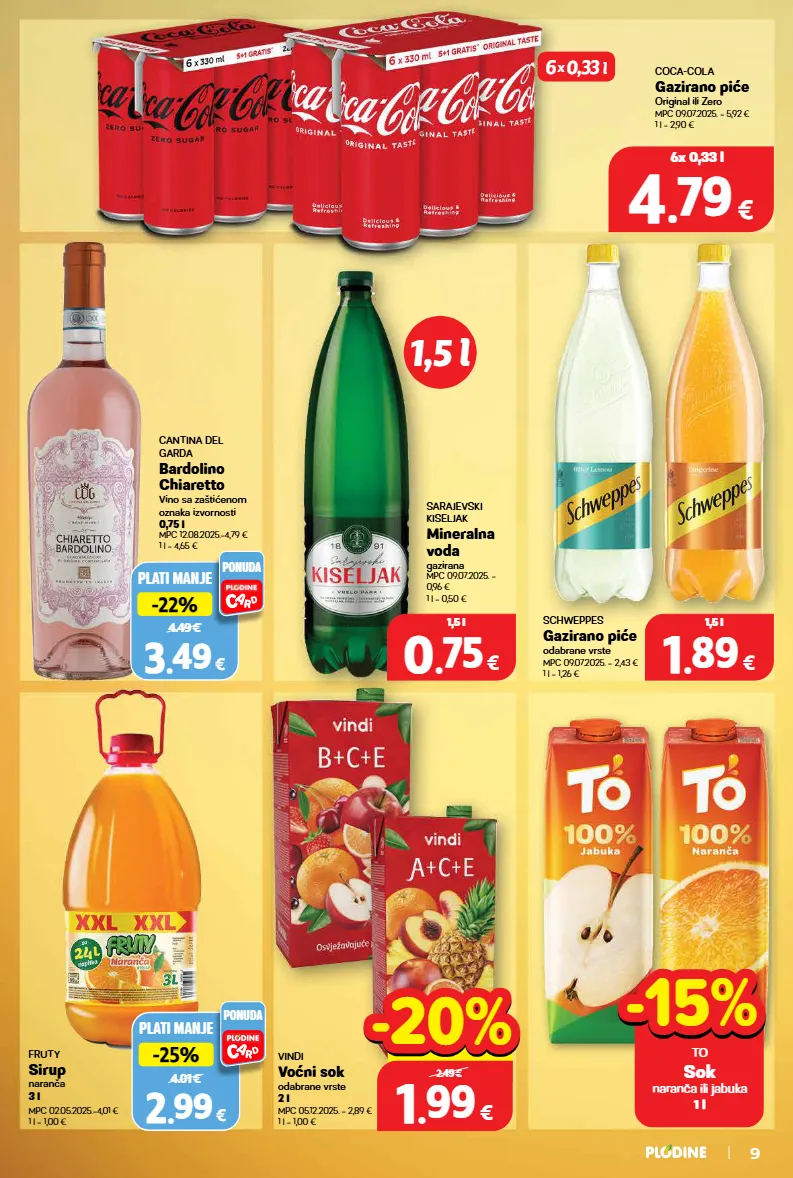 coca-cola gazirano piće original ili zero mpc 09.07.2025. = 5,92 € 1 l = 2,90 € 4 4 . . 79 79 € 6x 0,33 l 6 x 0,33 l vindi voćni sok odabrane vrste 2 l mpc 05.12.2025. = 2,89 € 1 l = 1,00 € 1 1 . . 99 99 € 2 l 2.49 € -20% -20% schweppes gazirano piće odabrane vrste mpc 09.07.2025. = 2,43 € 1 l = 1,26 € 1 1 . . 89 89 € 1,5 l sarajevski kiseljak mineralna voda gazirana mpc 09.07.2025. = 0,96 € 1 l = 0,50 € 0 0 . . 75 75 € 1,5 l plati manje 4.01 € -25% -25% 2 2 . . 99 99 € ponuda fruty sirup naranča 3 l mpc 02.05.2025.=4,01 € 1 l = 1,00 € to sok naranča ili jabuka 1 l -15% -15% plati manje 4.49 € -22% -22% 3 3 . . 49 49 € ponuda cantina del garda bardolino chiaretto vino sa zaštićenom oznaka izvornosti 0,75 l mpc 12.08.2025.=4,79 € 1 l = 4,65 € 1,5 l 9