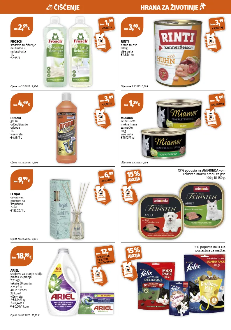 kom 9, 99 € kom 3, 69 € kom 1, 29 € kom 2, 95 € kom 4, 49 € uz aplikaciju kom 1, 99 € 1,99/1 l uz aplikaciju kom 3, 09 € 3,09/1 l uz aplikaciju kom 6, 99 € 93,20/1 l uz aplikaciju kom 3, 19 € 3,98/1 kg uz aplikaciju kom 1, 00 € 12,50/1 kg uz aplikaciju 15 % akcija uz aplikaciju 15 % akcija kom 18, 99 € kom 12, 99 1) € 5,77/1 kg 2) € 5,77/1 l 2) € 0,34/1 kom cijena na 2.5.2025.: 9,99 € fenjal osvježivač prostora sa štapićima 75 ml € 133,20/ 1 l rinti hrana za pse 800 g više vrsta € 4,62/1 kg cijena na 2.5.2025.: 3,69 € cijena na 2.5.2025.: 1,29 € miamor feine filets mokra hrana za mačke 80 g više vrsta € 16,13/1 kg cijena na 2.5.2025.: 2,95 € cijena na 2.5.2025.: 4,29 € drano gel za odčepljivanje odvoda 1 l više vrsta € 4,49/ 1 l frosch sredstvo za čišćenje neutralno ili na bazi octa 1 l € 2,95/ 1 l cijena na 6.2.2026.: 18,99 € ariel sredstvo za pranje rublja prašak 45 pranja 2,25 kg 1) , tekuće 50 pranja 2,25 l 2) ili all-in-1 pods 38 kom 3) više vrsta 1) € 8,44/1 kg 2) € 8,44/ 1 l 3) € 0,50/ 1 kom 15 % popusta na animonda vom feinsten mokru hranu za pse 100 g ili 150 g. 15 % popusta na felix poslastice za mačke. čišćenje hrana za životinje