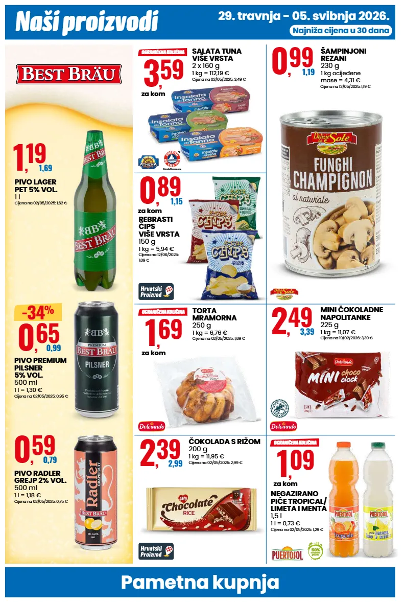 naši proizvodi pametna kupnja 29. travnja - 05. svibnja 2026. najniža cijena u 30 dana 3 , 59 za kom friendofthesea.org ograničena količina salata tuna više vrsta 2 x 160 g 1 kg = 112,19 € cijena na 02/05/2025: 3,49 € 0 , 99 1,19 šampinjoni rezani 230 g 1 kg ocijeđene mase = 4,31 € cijena na 13/05/2025: 1,19 € 0 , 89 1,15 za kom rebrasti čips više vrsta 150 g 1 kg = 5,94 € cijena na 12/06/2025: 1,09 € 1 , 69 za kom ograničena količina torta mramorna 250 g 1 kg = 6,76 € cijena na 02/05/2025: 1,69 € 2 , 49 3,39 mini čokoladne napolitanke 225 g 1 kg = 11,07 € cijena na 19/02/2026: 3,39 € 2 , 39 2,99 čokolada s rižom 200 g 1 kg = 11,95 € cijena na 02/05/2025: 2,99 € 1 , 09 za kom 50% recycled plastic ograničena količina negazirano piće tropical/ limeta i menta 1,5 l 1 l = 0,73 € cijena na 02/05/2025: 1,29 € 1 , 19 1,69 pivo lager pet 5% vol. 1 l cijena na 02/05/2025: 1,62 € 0 , 59 0,79 pivo radler grejp 2% vol. 500 ml 1 l = 1,18 € cijena na 02/05/2025: 0,75 € 0 , 65 0,99 -34 % pivo premium pilsner 5% vol. 500 ml 1 l = 1,30 € cijena na 02/05/2025: 0,95 €