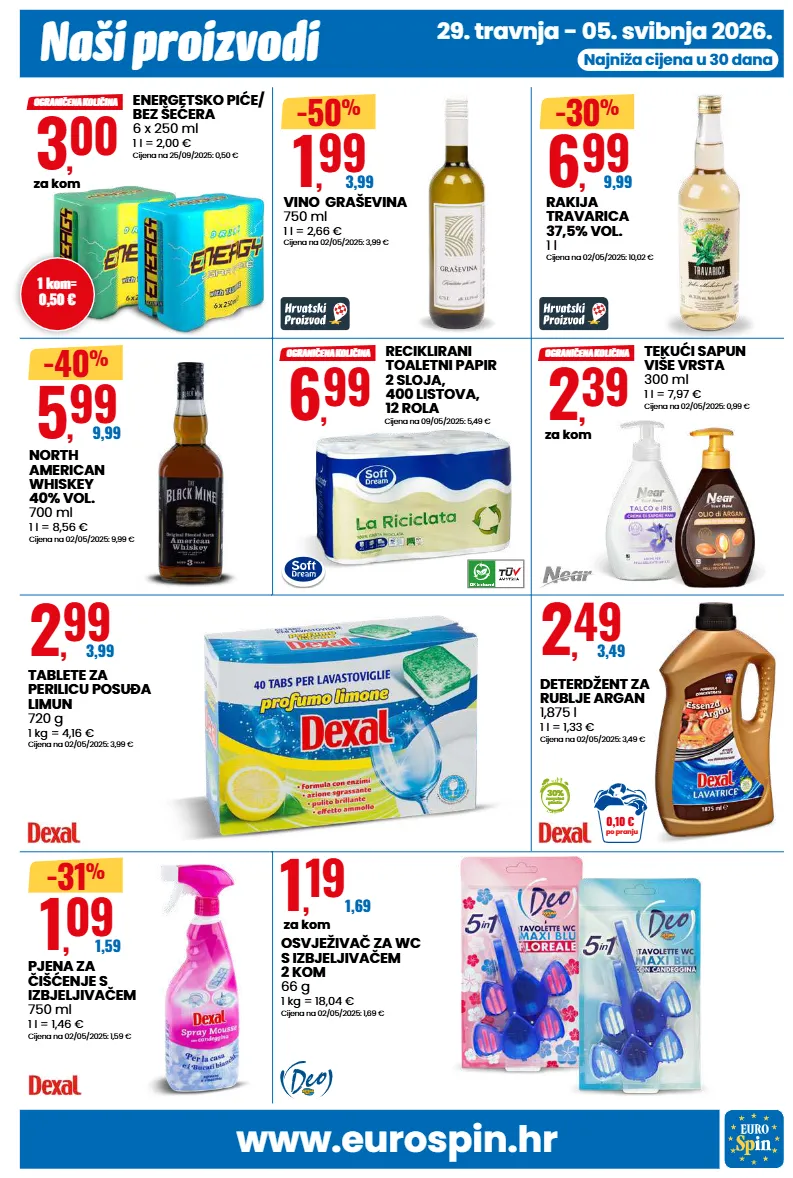 www.eurospin.hr naši proizvodi 29. travnja - 05. svibnja 2026. najniža cijena u 30 dana 3 , 00 za kom ograničena količina energetsko piće/ bez šećera 6 x 250 ml 1 l = 2,00 € cijena na 25/09/2025: 0,50 € 1 , 99 3,99 -50 % vino graševina 750 ml 1 l = 2,66 € cijena na 02/05/2025: 3,99 € 6 , 99 9,99 -30 % rakija travarica 37,5% vol. 1 l cijena na 02/05/2025: 10,02 € 5 , 99 9,99 -40 % north american whiskey 40% vol. 700 ml 1 l = 8,56 € cijena na 02/05/2025: 9,99 € 2 , 99 3,99 tablete za perilicu posuða limun 720 g 1 kg = 4,16 € cijena na 02/05/2025: 3,99 € 1 , 19 1,69 za kom osvježivač za wc s izbjeljivačem 2 kom 66 g 1 kg = 18,04 € cijena na 02/05/2025: 1,69 € 2 , 39 za kom ograničena količina tekući sapun više vrsta 300 ml 1 l = 7,97 € cijena na 02/05/2025: 0,99 € 6 , 99 ograničena količina reciklirani toaletni papir 2 sloja, 400 listova, 12 rola cijena na 09/05/2025: 5,49 € 1 , 09 1,59 -31 % pjena za čišćenje s izbjeljivačem 750 ml 1 l = 1,46 € cijena na 02/05/2025: 1,59 € 2 , 49 3,49 deterdžent za rublje argan 1,875 l 1 l = 1,33 € cijena na 02/05/2025: 3,49 € po pranju 0,10 € 30% recycled plastic 1 kom= 0,50 €